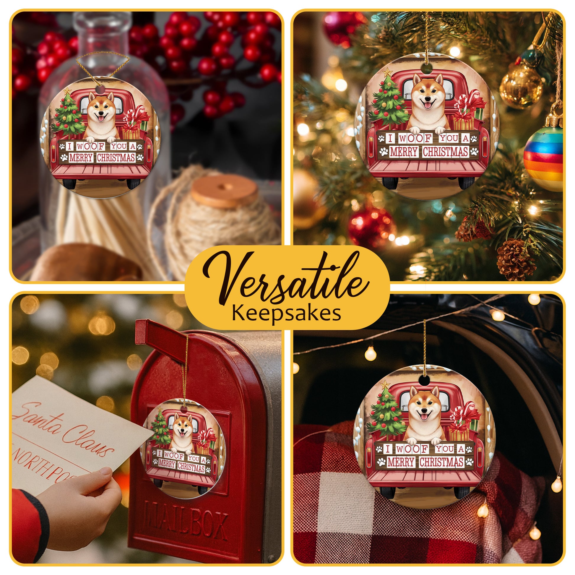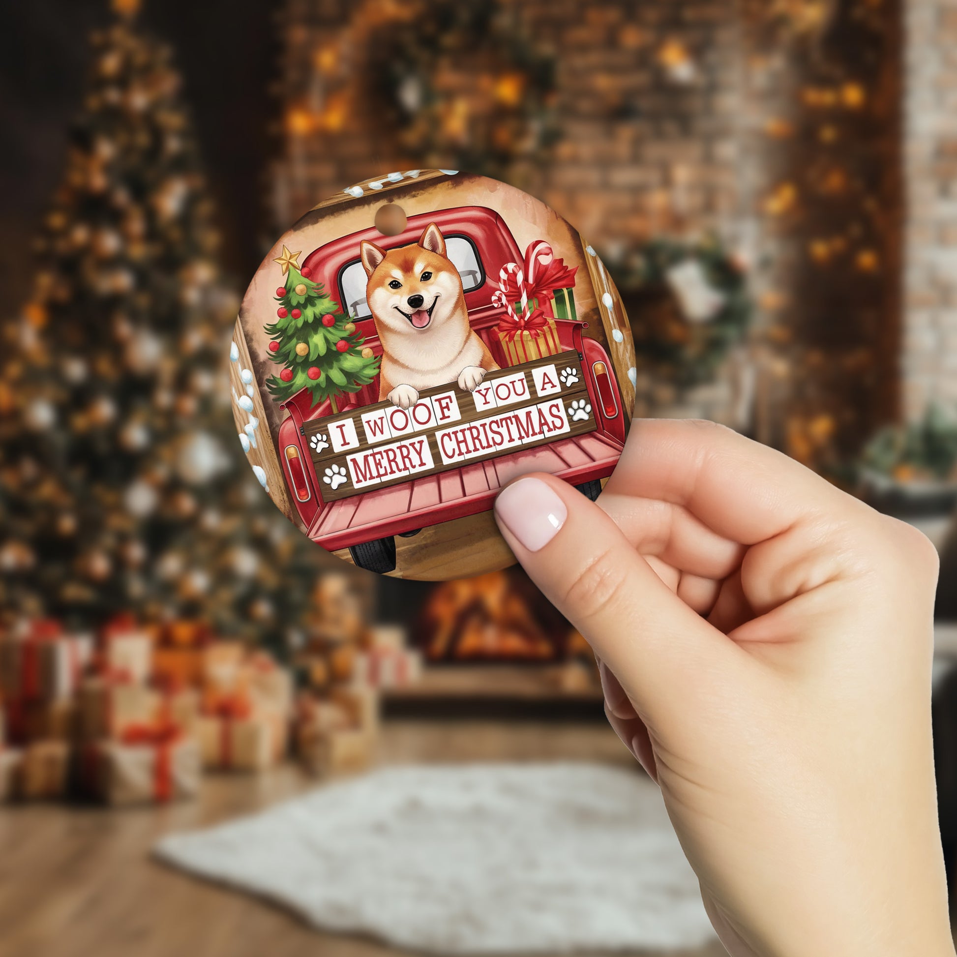 Netecom Cute Shiba Inu in Holiday Truck Ornament, I Woof You a Merry Christmas Ceramic Ornament for Christmas Tree Hanging Decorations Gift, Dog Lover Gifts, Holiday Decor Present