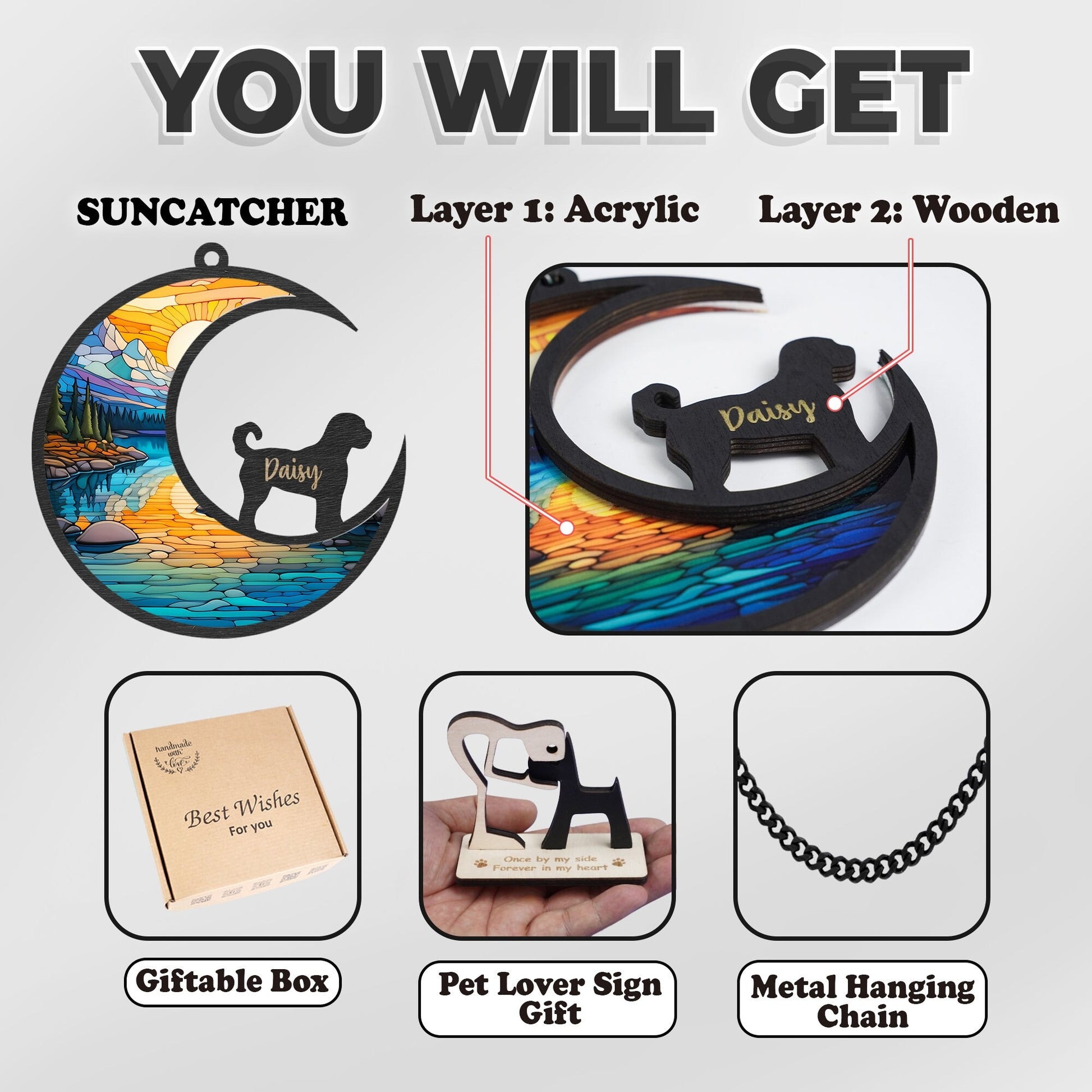 This Dog Memorial Suncatcher is more than just a decoration—it’s a personalized keepsake that honors your pet's legacy. Whether for your own home or as a thoughtful gift for a friend or family member, this suncatcher will always remind you of the love, joy, and memories shared with your dog.