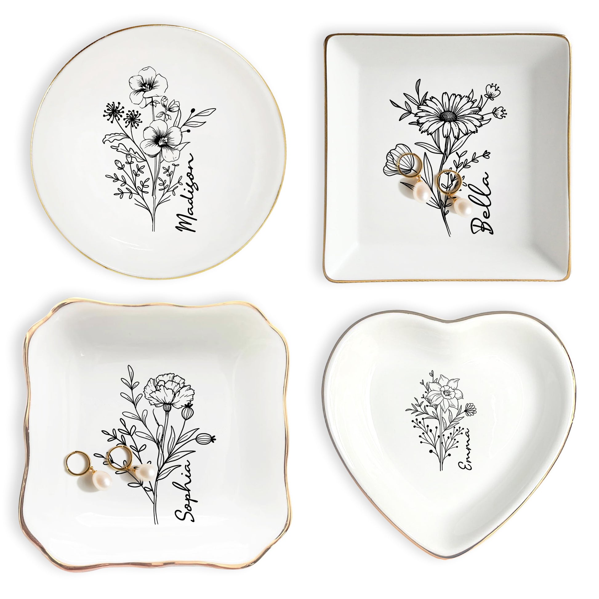 Netecom Elegant Personalized Birth Month Flower Jewelry Dish Set, Custom Name Gold Rim Ceramic Ring Tray for Bridesmaid & Mother's Day Gift