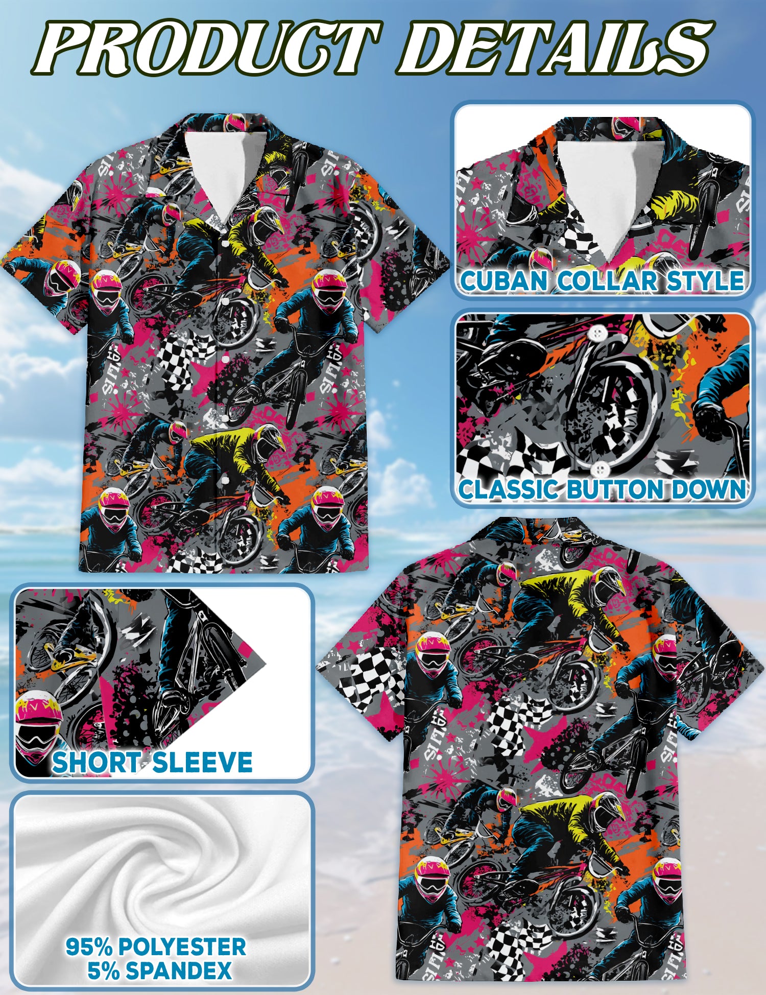 Netecom Freestyle BMX Hawaiian Shirt for Men, Colorful Pop Art Bicycle Rider Graphic Button Down Shirt