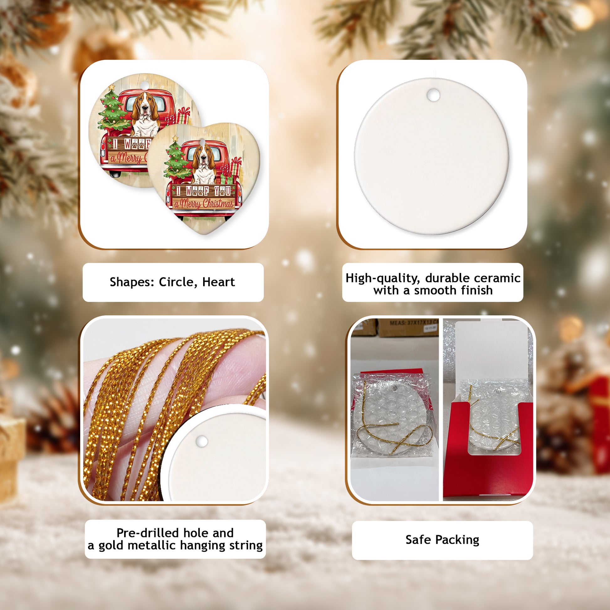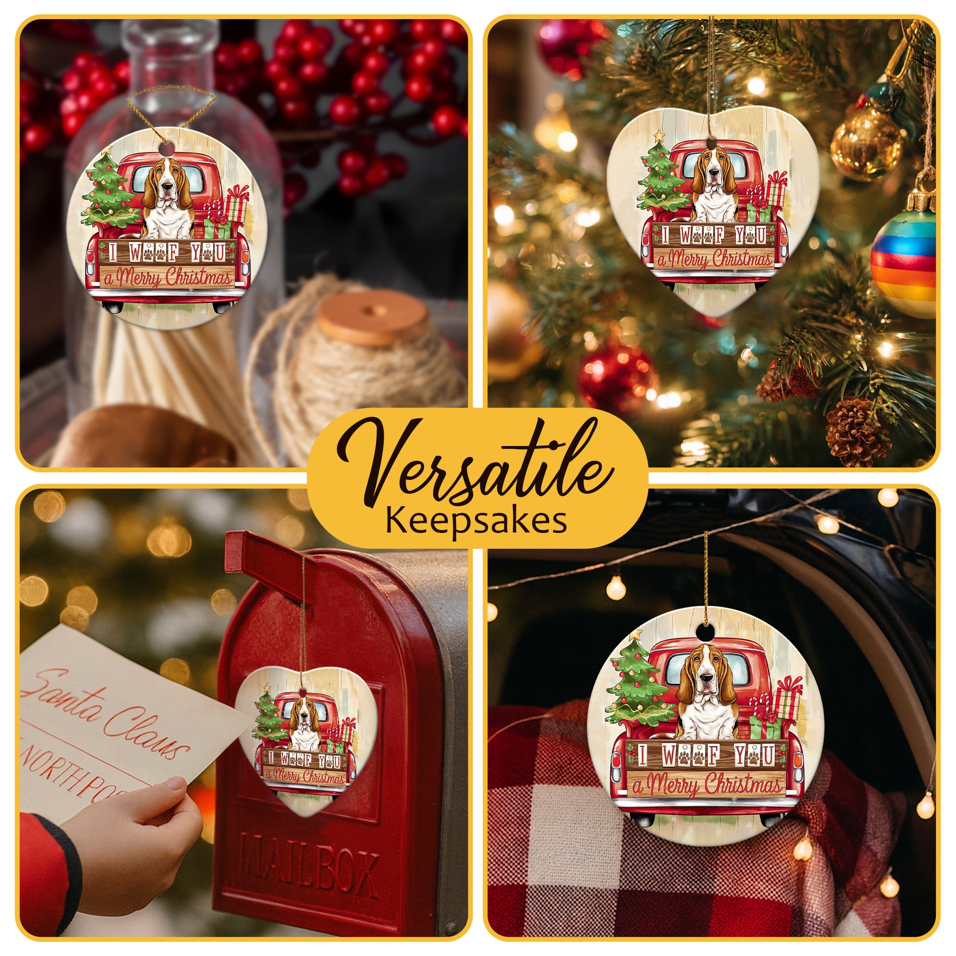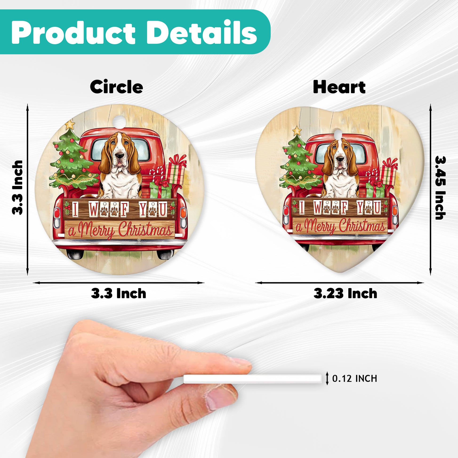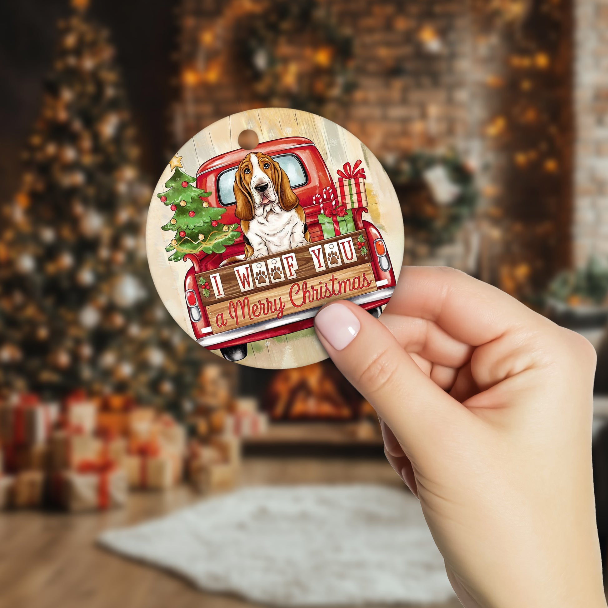 Netecom Funny Basset Hound in Holiday Truck Ornament, I Woof You a Merry Christmas Ceramic Ornament for Christmas Tree Hanging Decorations Gift, Pet Lover Gifts, Holiday Party Present