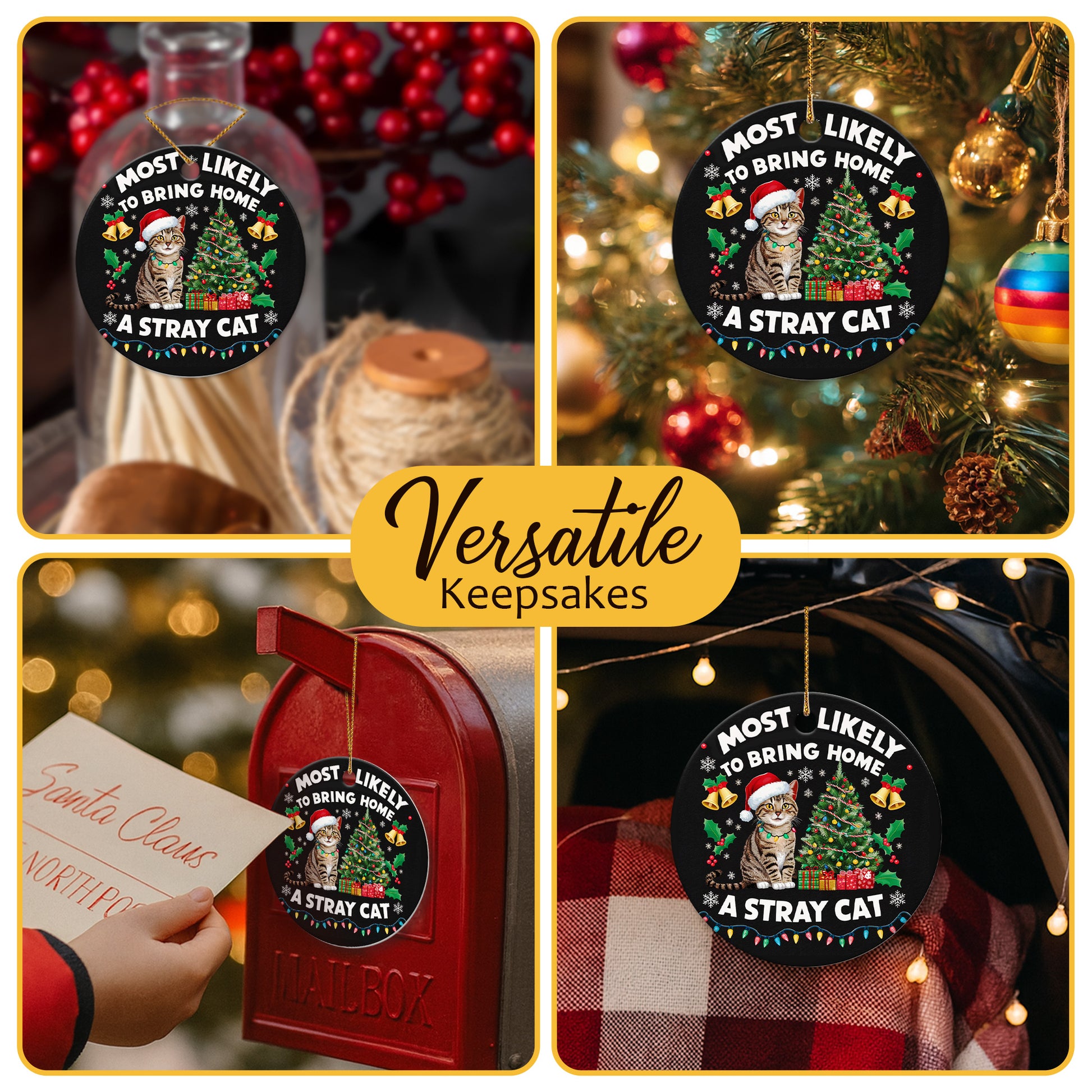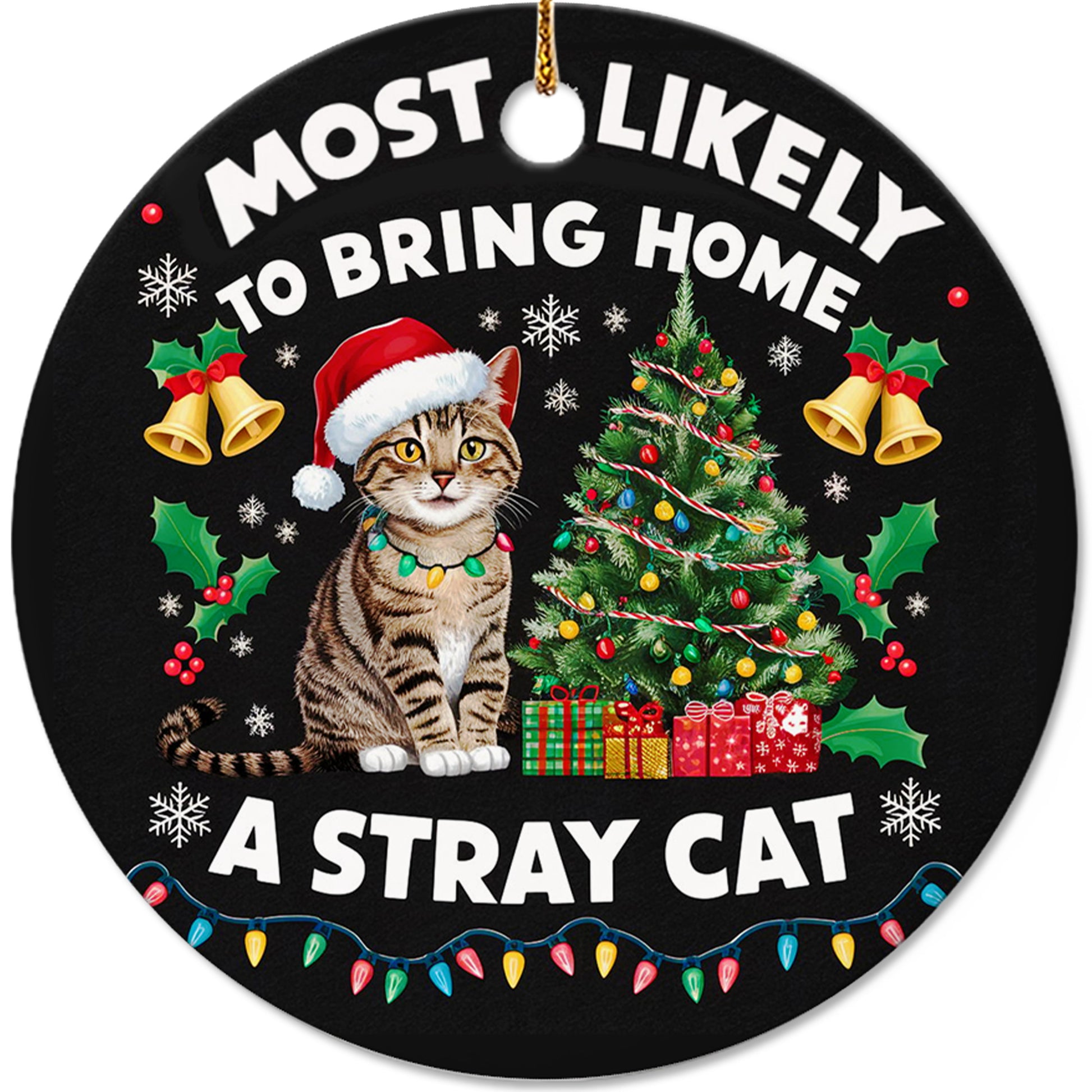 Netecom Funny Cat in Santa Hat with Christmas Tree Ornament, Most Likely to Bring Home a Stray Cat Ceramic Ornament for Xmas Tree Hanging Decorations Gift, Pet Lover Gift, Holiday Party Present