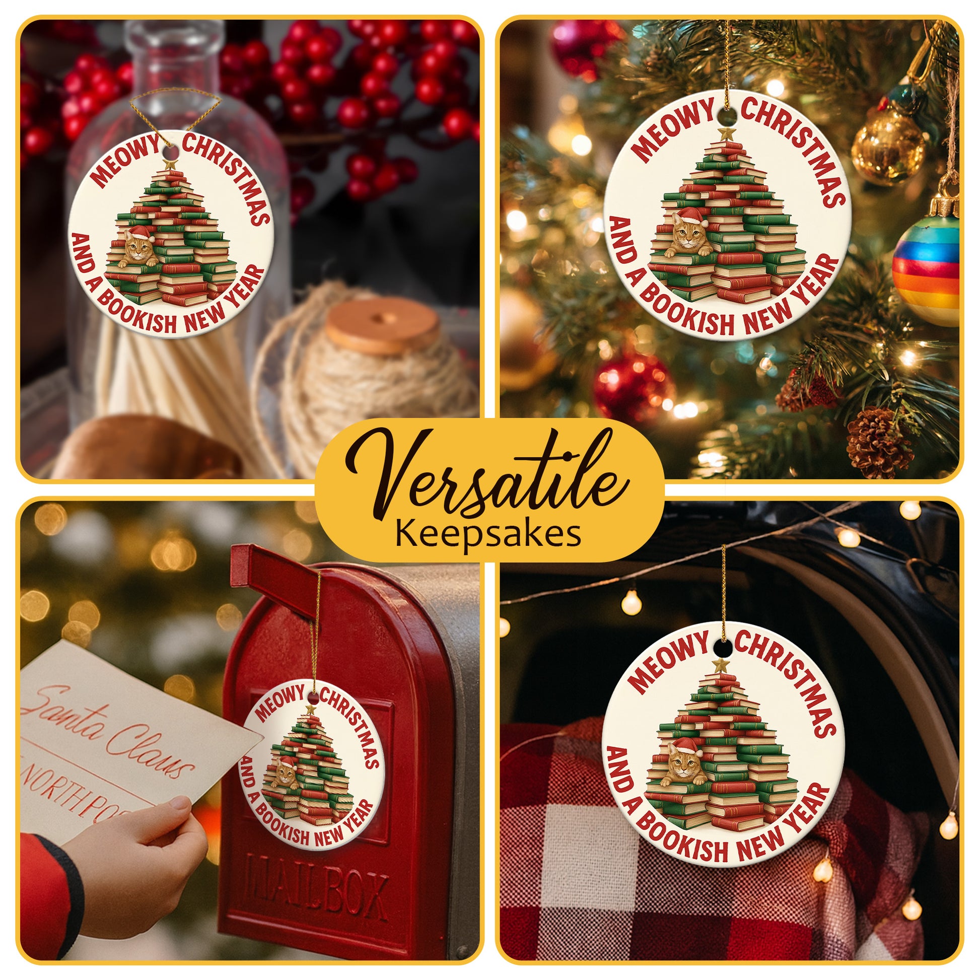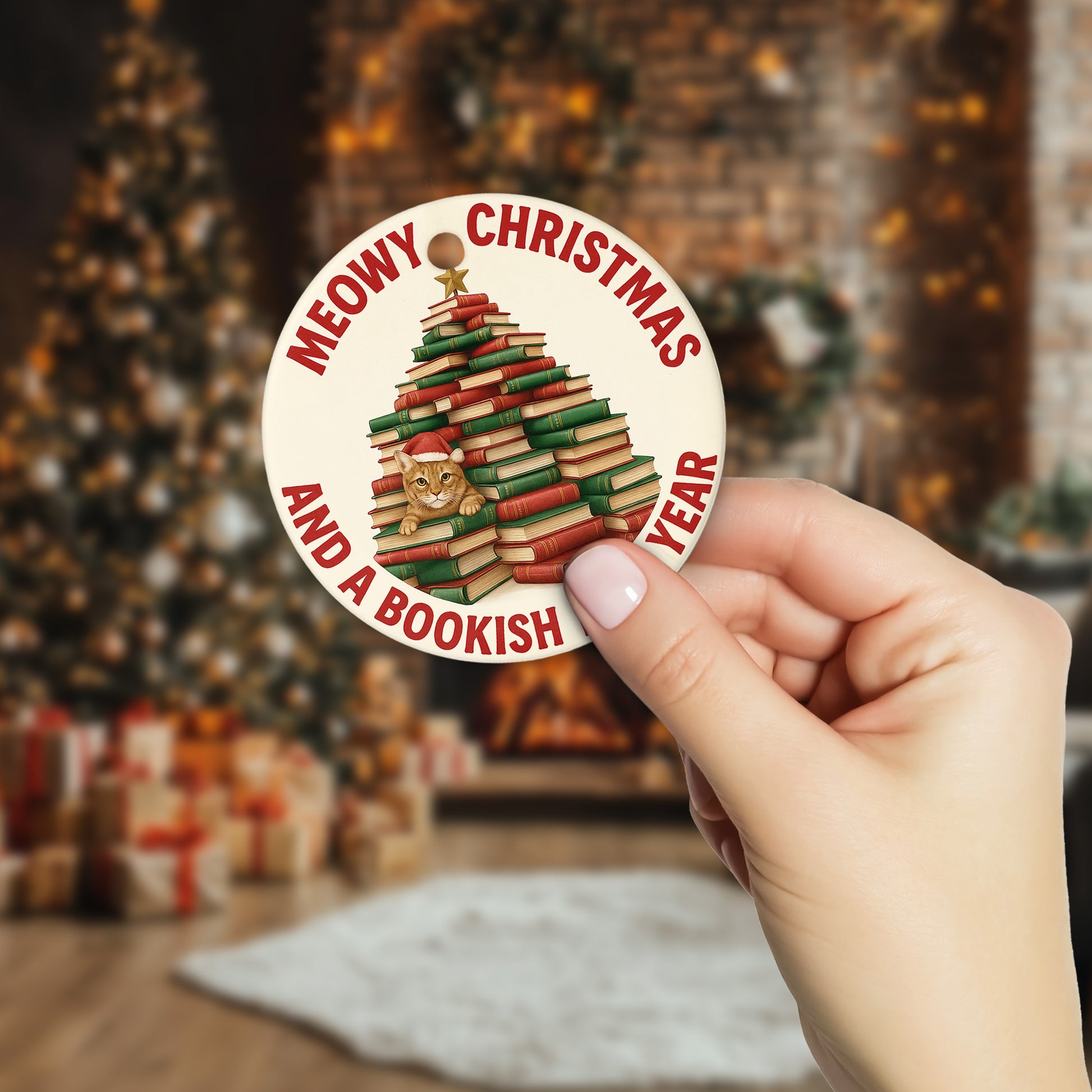 Netecom Funny Cat with Book Stack Ornament, Meowy Catmas and Bookish Christmas Tree Ceramic Ornament for Xmas Tree Hanging Decorations Gift, Book Lover Gifts for Women, Holiday Party Present