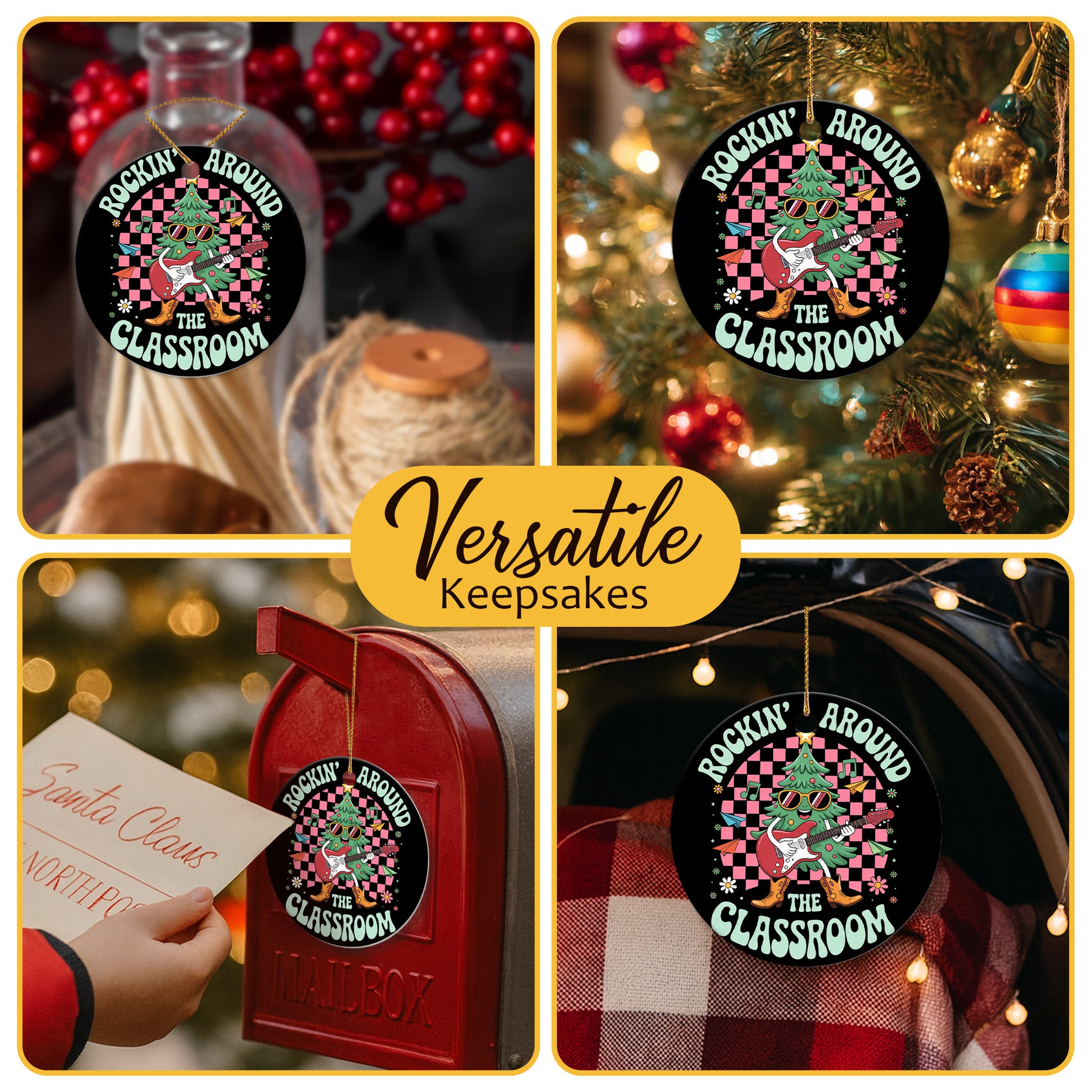 Netecom Funny Christmas Rock Ornament, Rockin' Around The Classroom Ceramic Ornament for Xmas Tree Hanging Decorations Gift, Gifts for Guitar Player Music Enthusiasts, Holiday Party Present