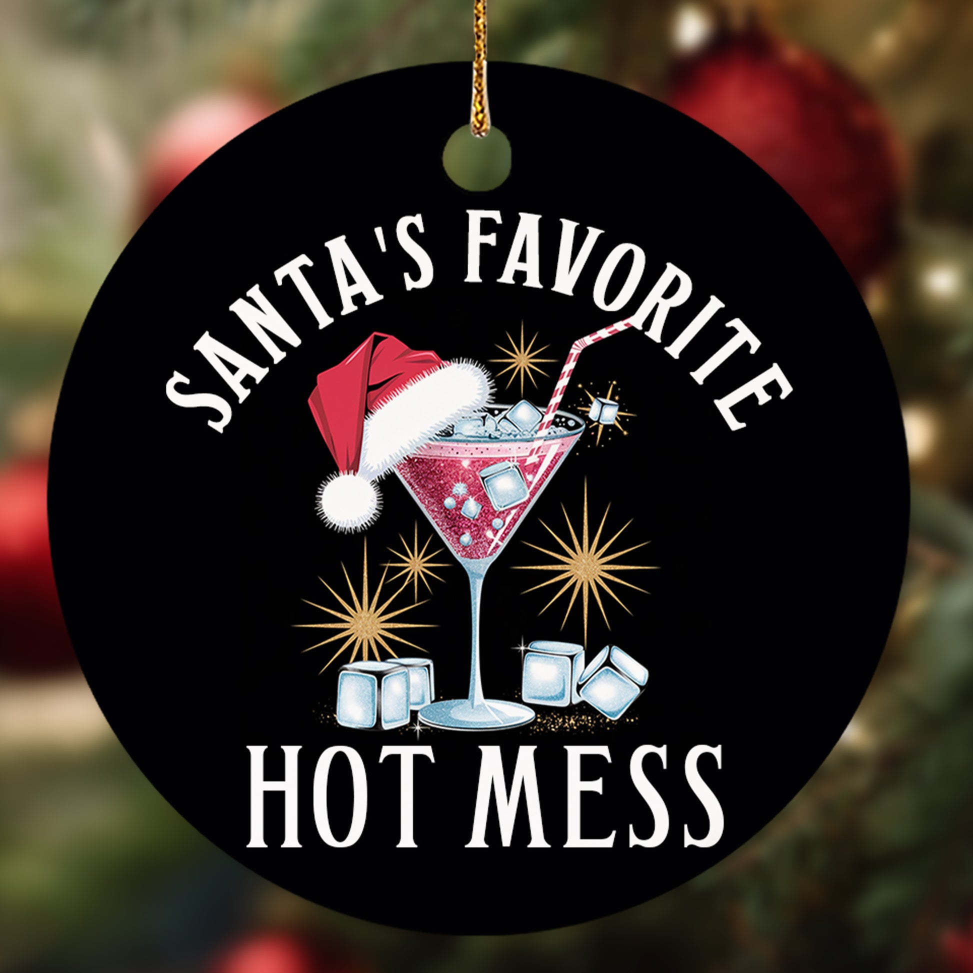 Netecom Funny Cocktail with Santa Hat Christmas Ornament, Santa's Favorite Hot Mess Ceramic Ornament for Xmas Tree Hanging Decorations Gift, Gifts for Friends & Family, Holiday Party Present