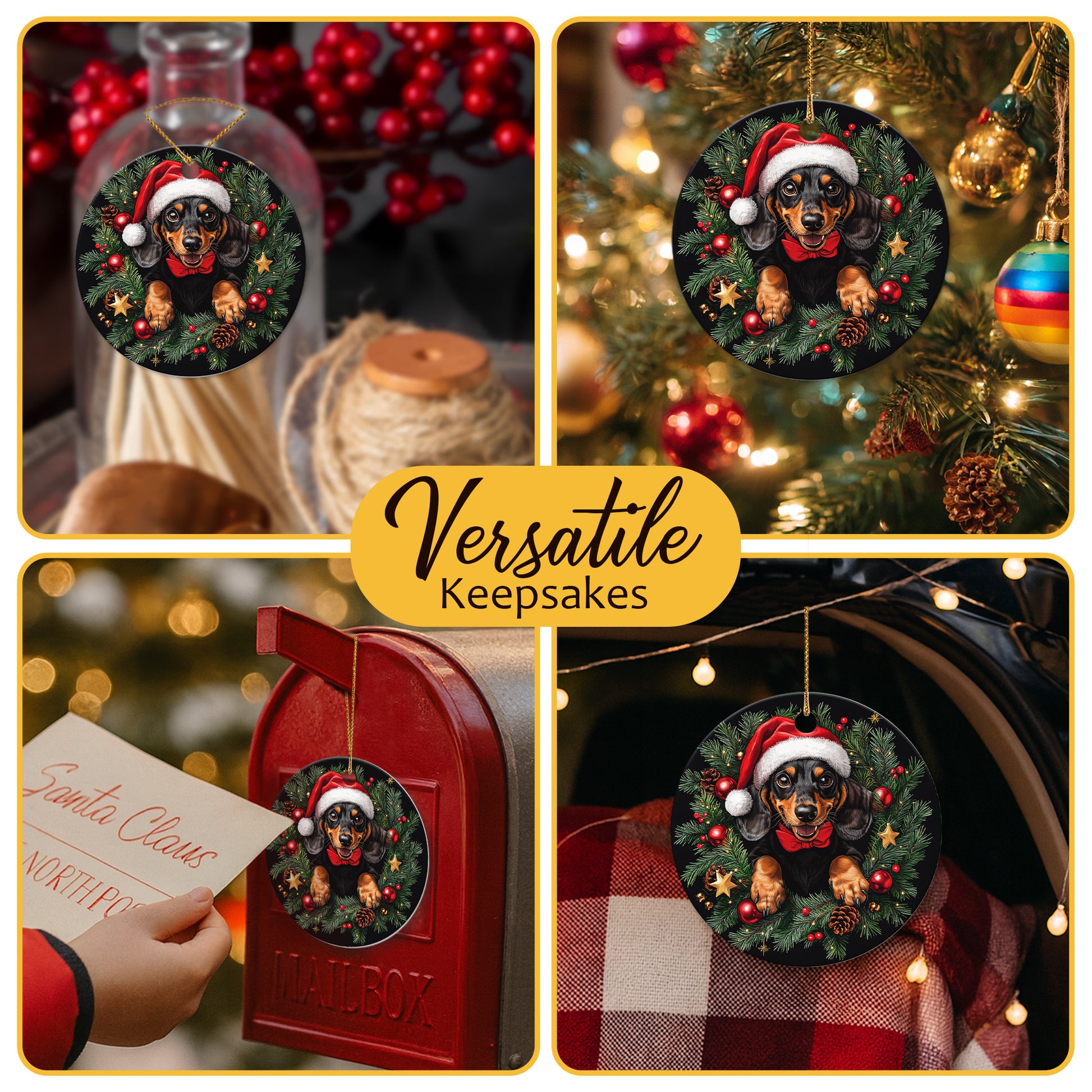 Netecom Funny Dachshund in Santa Hat Christmas Ornament, Wiener Dog Ceramic Ornament for Xmas Tree Hanging Decorations Gift, Dog Lover Gifts, Holiday Party Present