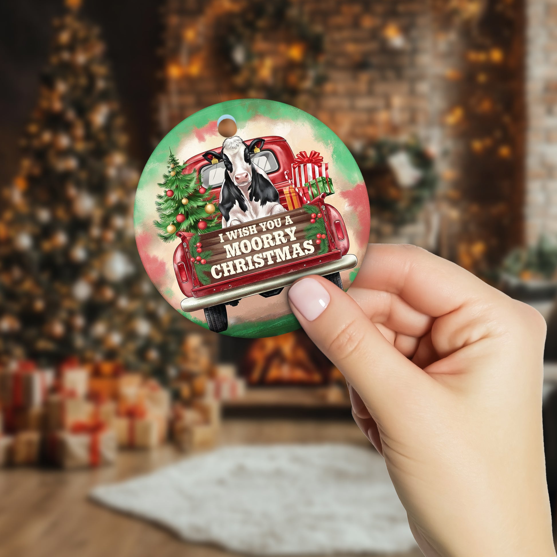 Netecom Funny Dairy Cattle in Red Truck Ornament, I Wish You a Moorry Christmas Ceramic Ornament for Christmas Tree Hanging Decorations Gift, Farm Animal Lover Gifts, Holiday Party Present