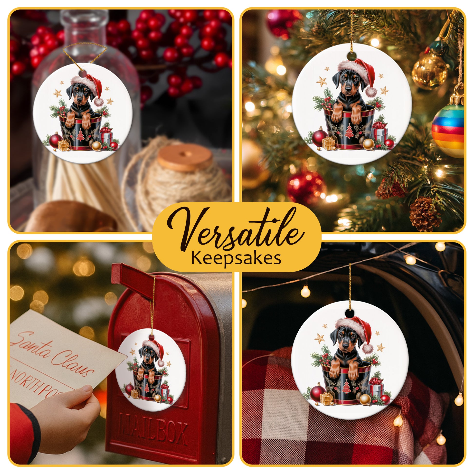 Netecom Funny Doberman in Bucket Ornament, Dog with Santa Hat Ceramic Ornament for Christmas Tree Hanging Decorations Gift, Dobie Dog Lover Gifts, Home Decor, Holiday Party Present