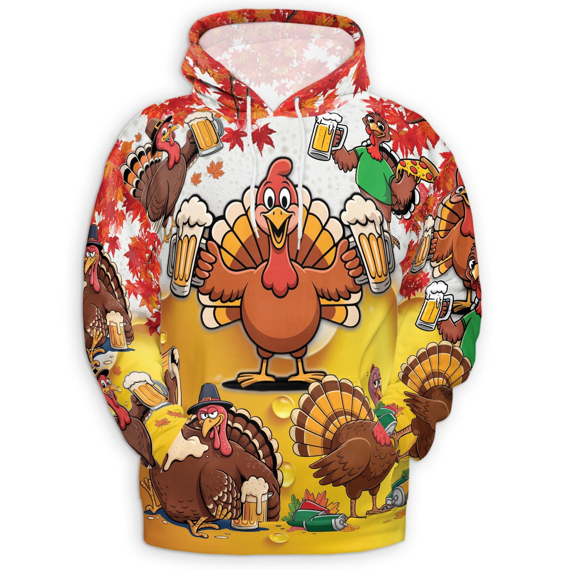 Netecom Funny Drunk Turkey Thanksgiving 3D Hoodie with Front Pocket, Unisex Casual All Over Graphic Sweatshirt