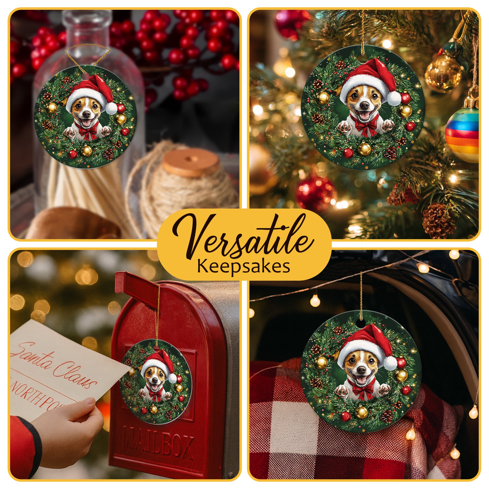 Netecom Funny Jack Russell Terrier Christmas Ornament, Dog Santa Hat Ceramic Ornament for Xmas Tree Hanging Decorations Gift, Puppy Lover Gifts, Home Decor, Holiday Party Present