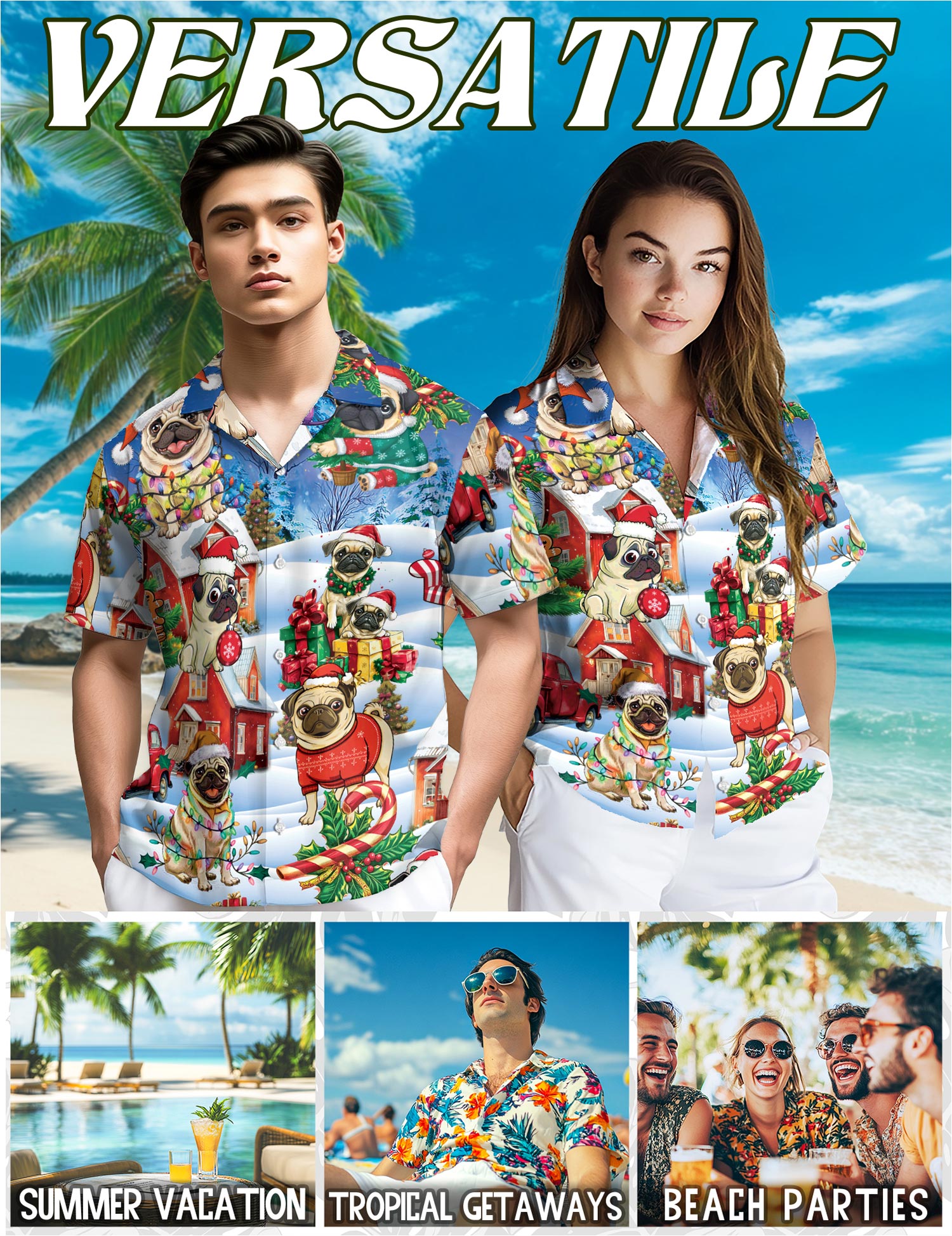 Netecom Funny Pug Christmas Hawaiian Shirt for Men, Cute Dog Holiday Print Button Down Summer Beach Short Sleeve Shirt, S-5XL