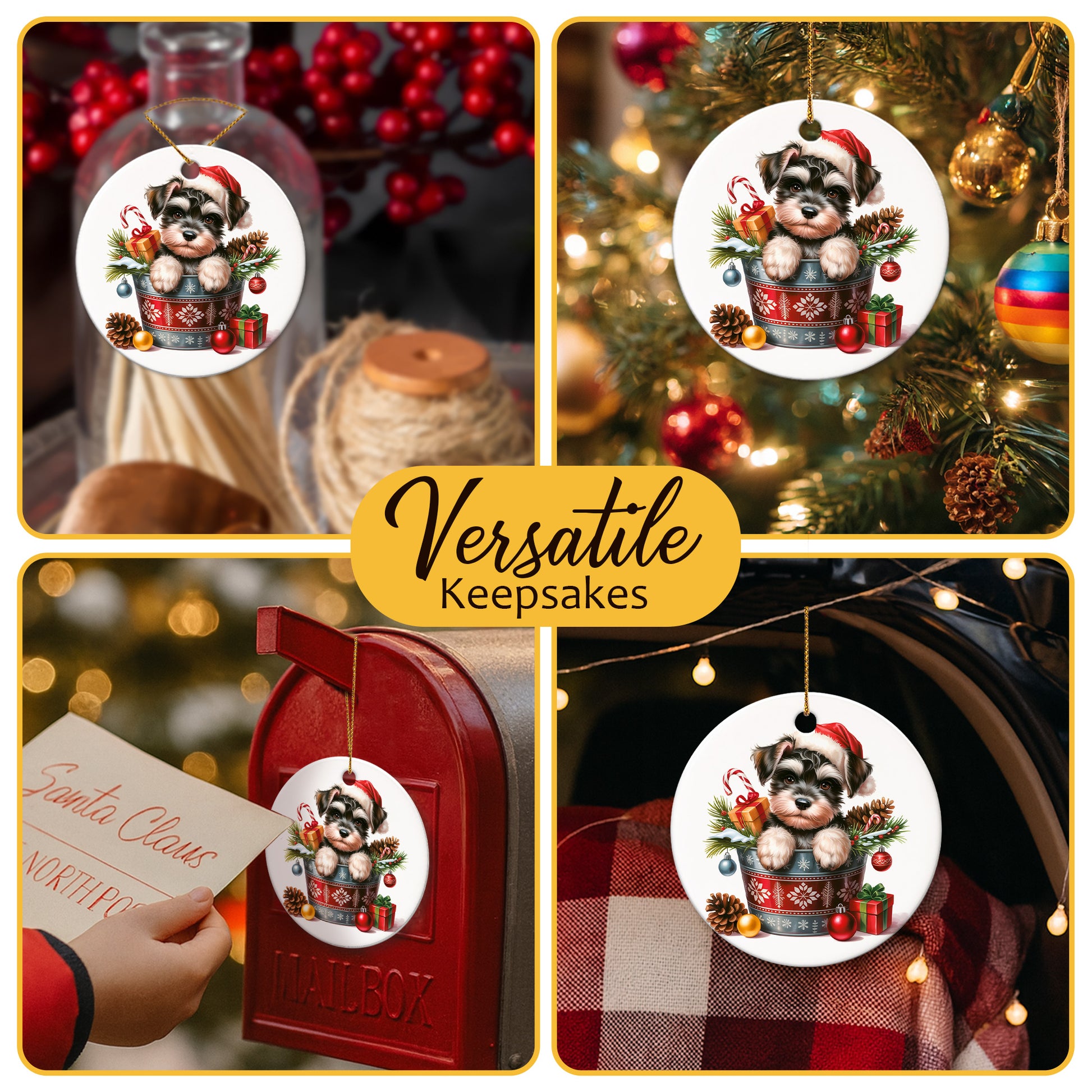 Netecom Funny Schnauzer in Bucket Ornament, Dog with Santa Hat Ceramic Ornament for Christmas Tree Hanging Decorations Gift, Puppy Lover Gifts, Home Decor, Holiday Party Present