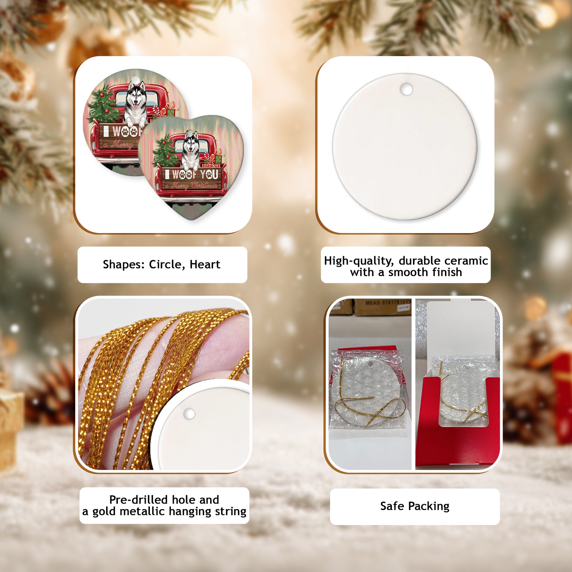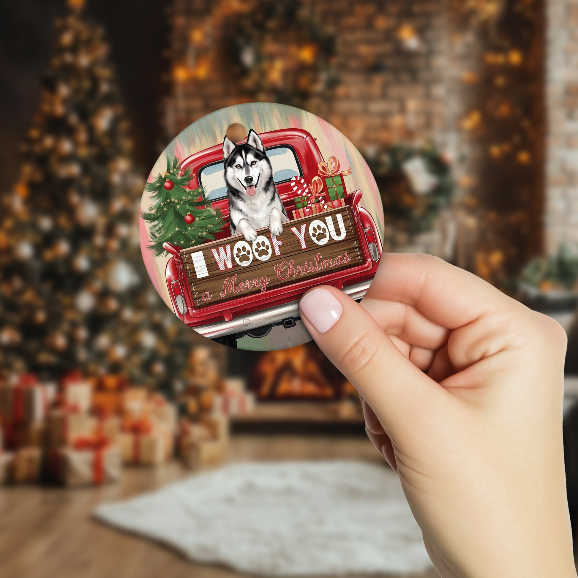 Netecom Funny Siberian Husky in Holiday Truck Ornament, I Woof You a Merry Christmas Ceramic Ornament for Christmas Tree Hanging Decorations Gift, Pet Lover Gifts, Holiday Party Present