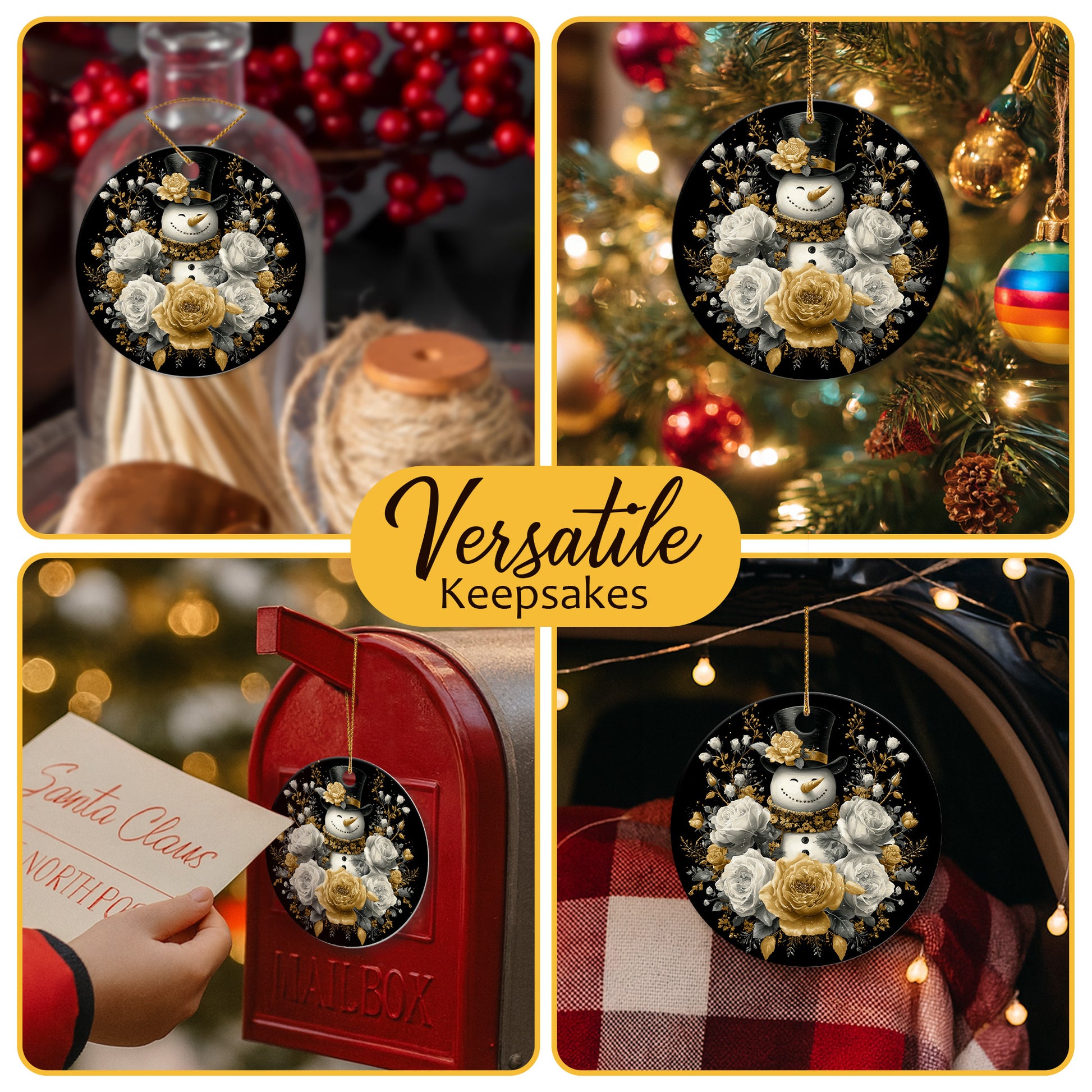 Netecom Funny Snowman Floral Ornament, Gold and White Christmas Ceramic Ornament for Xmas Tree Hanging Decorations Gift, Home Decor, Snowman Lover Gifts, Holiday Party Present