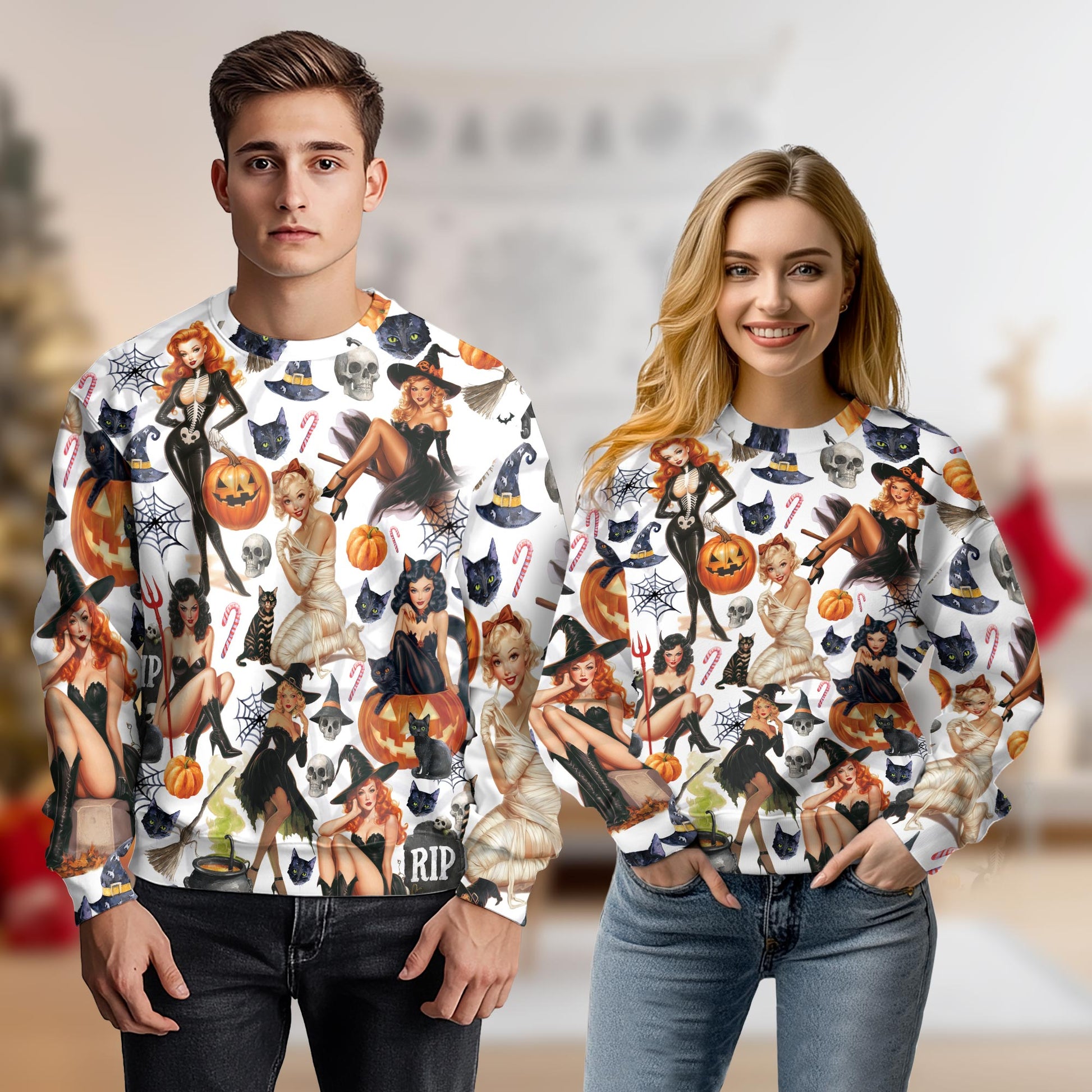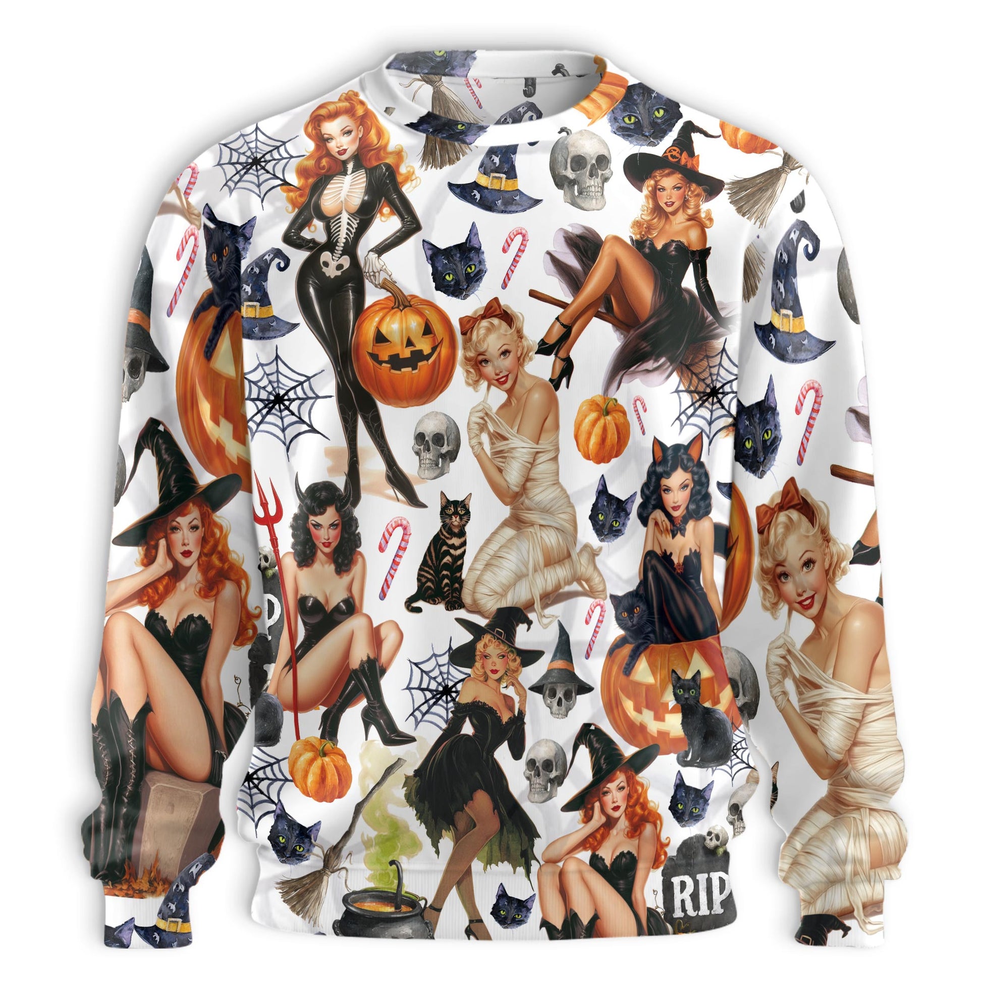 Netecom Halloween Pin Up Witch Sweatshirt 3D All Over Print, Retro Spooky Outfit, Crewneck Pullover for Costume Party