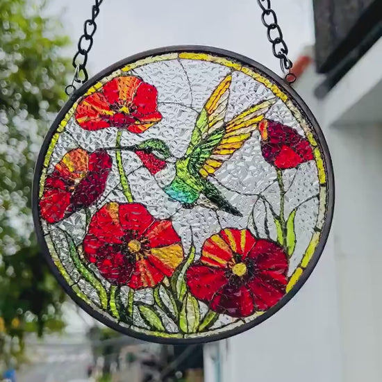 Handcrafted stained-glass design: Each piece is meticulously crafted with vivid colors and intricate details of a hummingbird and poppies.