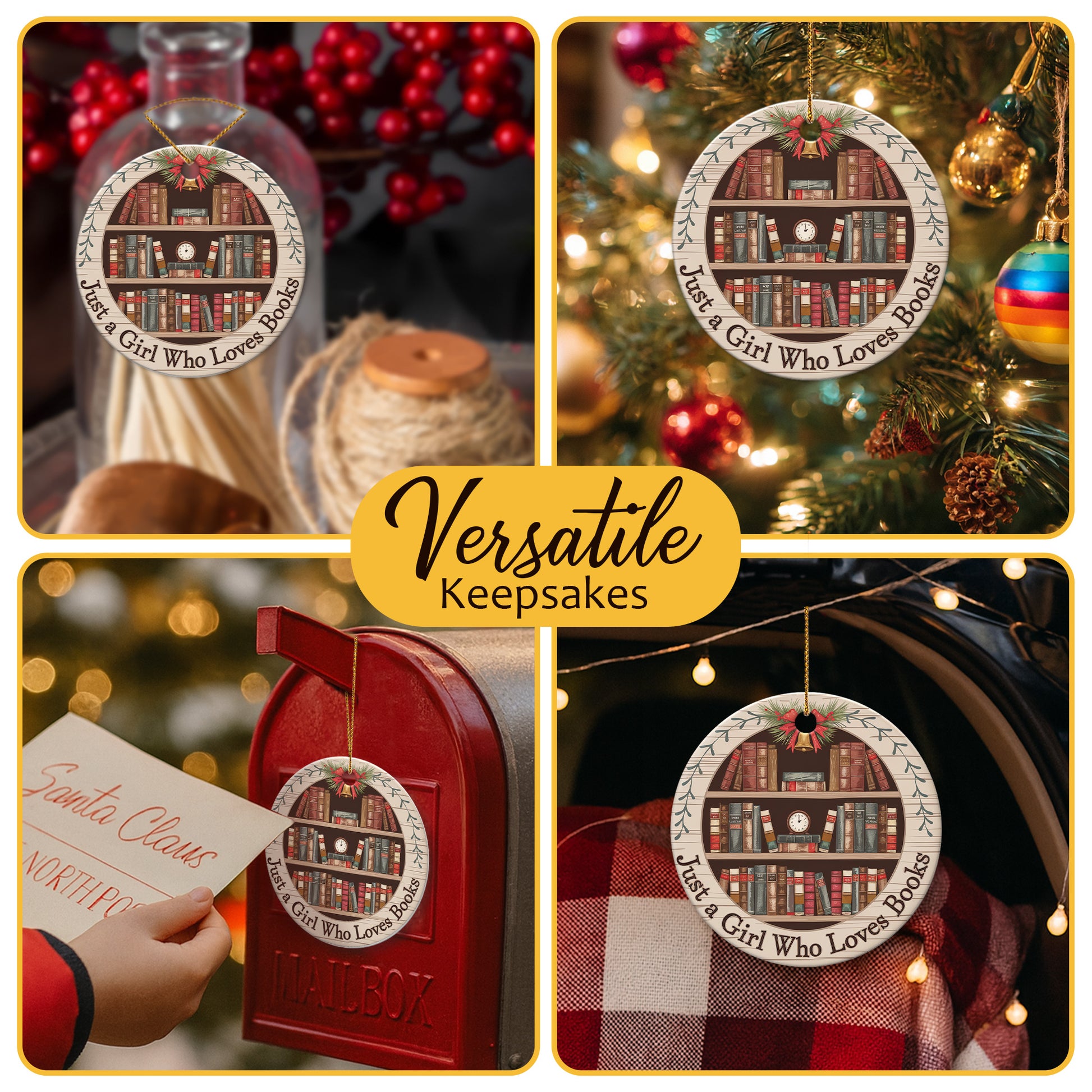 Netecom Just a Girl Who Loves Books Ornament, Bookshelf Circle Ceramic Ornament for Christmas Tree Hanging Decorations Gift, Book Lover Gifts for Women Librarian Teacher Bookworm Literature