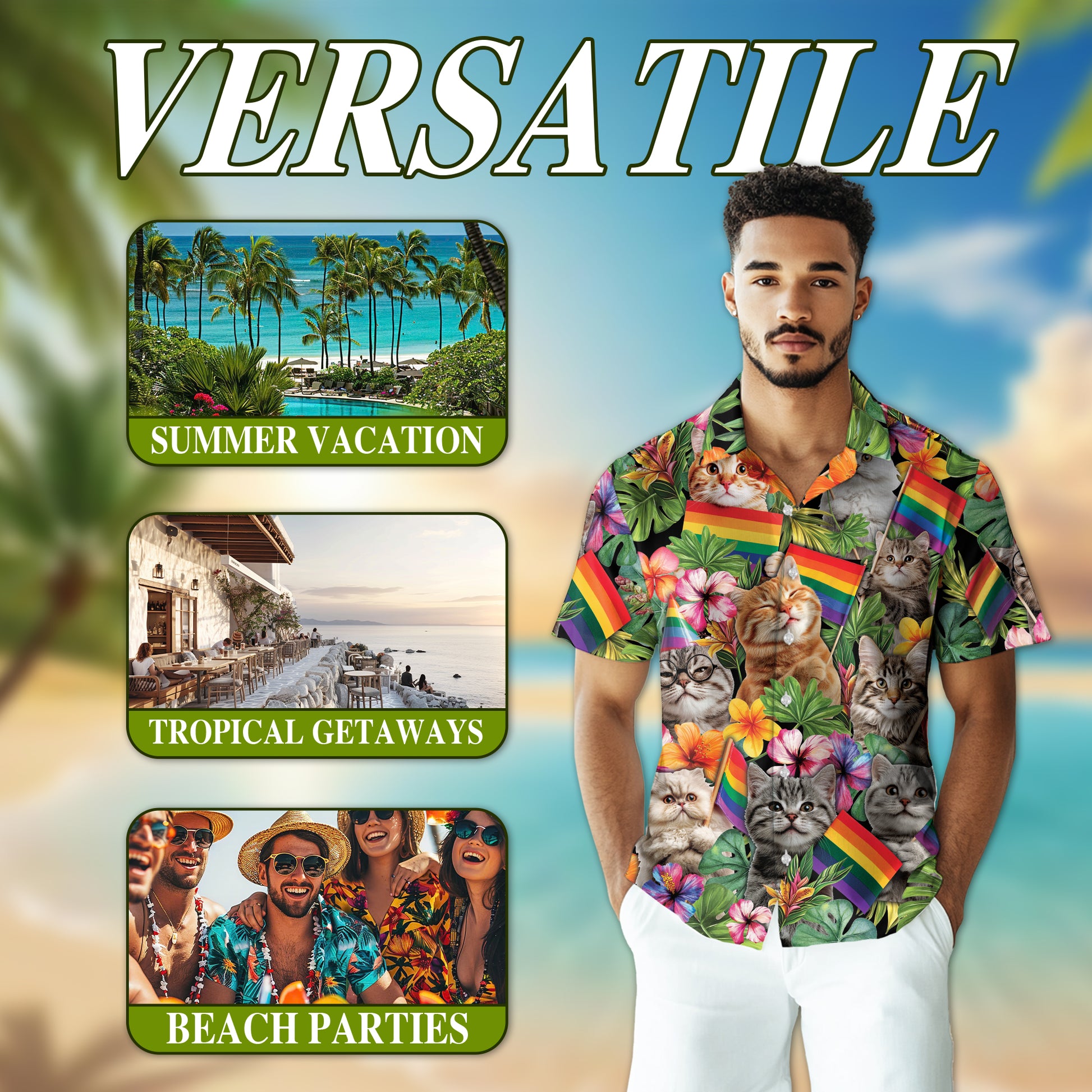 Netecom LGBT Pride Cat Hawaiian Shirt for Women, Cat Lover Gifts, Rainbow Flag Floral Button Down Summer Beach Shirts