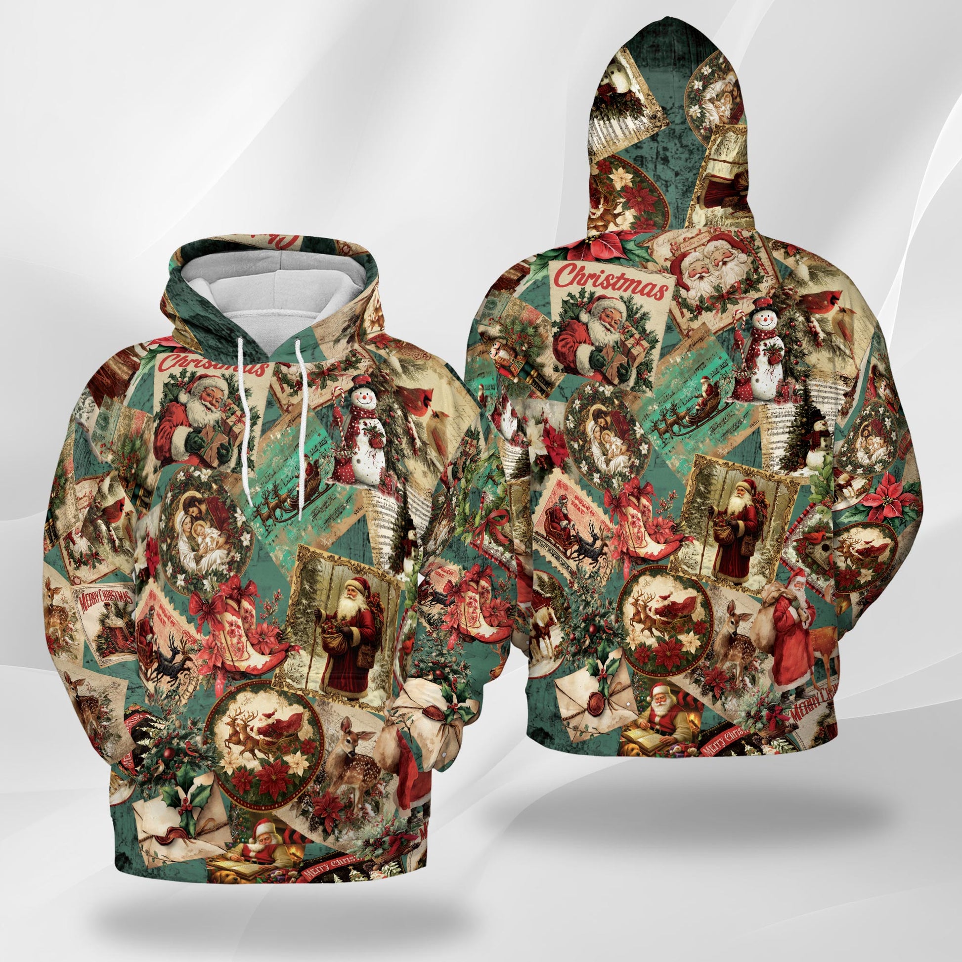 Netecom Merry Christmas Santa Claus Print Hoodie with Front Pocket, All Over Retro Holiday Graphic Sweatshirt Unisex Casual
