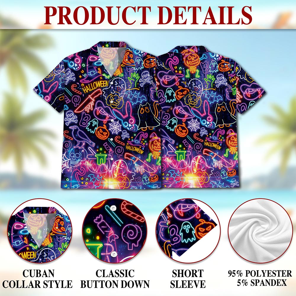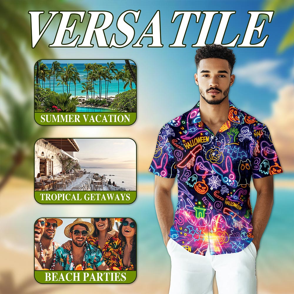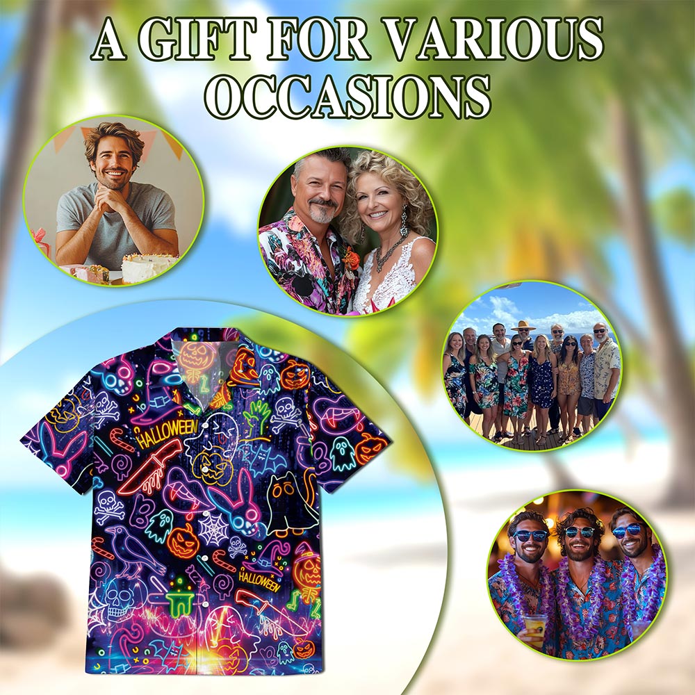 Netecom Neon Hawaiian Shirt for Men, Halloween Present, Skull Ghost Button Down Summer Beach Short Sleeve Shirts, S-5XL
