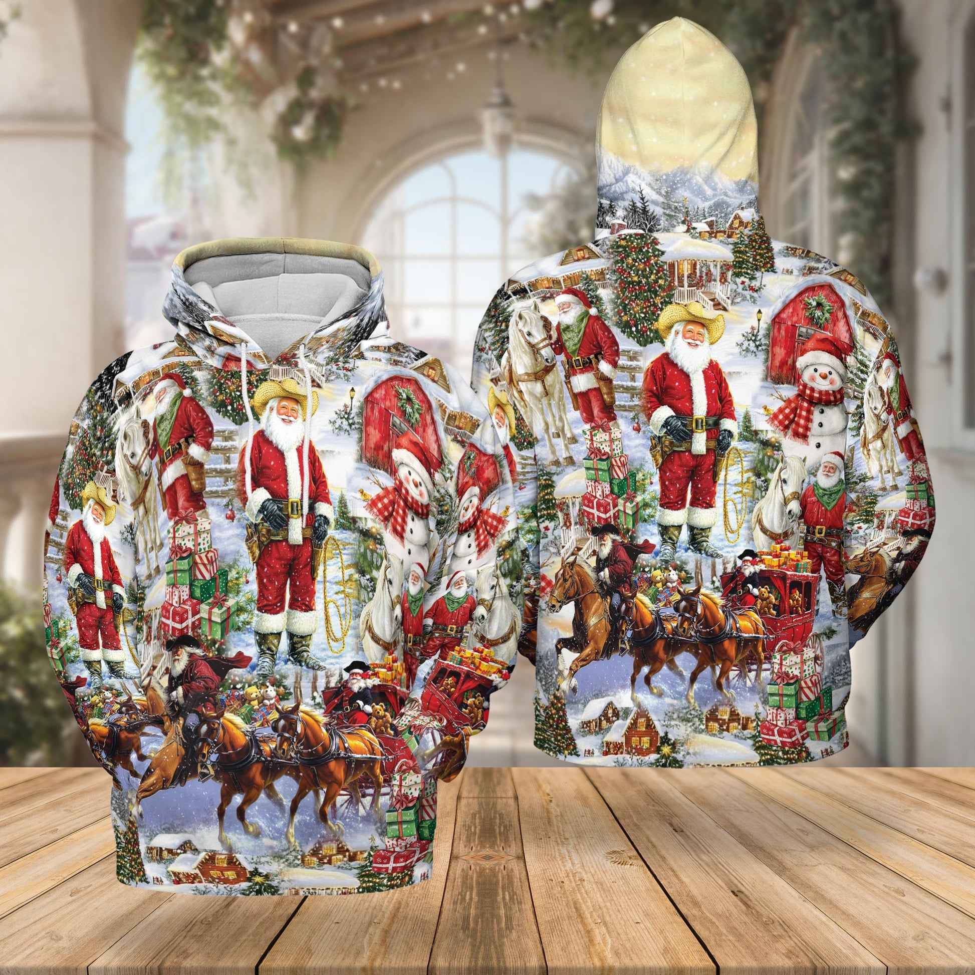 Netecom Cowboy Santa Christmas 3D Hoodie with Front Pocket, Unisex Casual All Over Vintage Holiday Graphic Sweatshirt