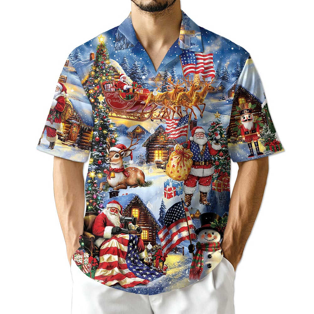 Netecom Patriotic Santa Claus Christmas Hawaiian Shirt for Men, USA Flag Holiday Print Button Down Summer Beach Shirt, S-5XL