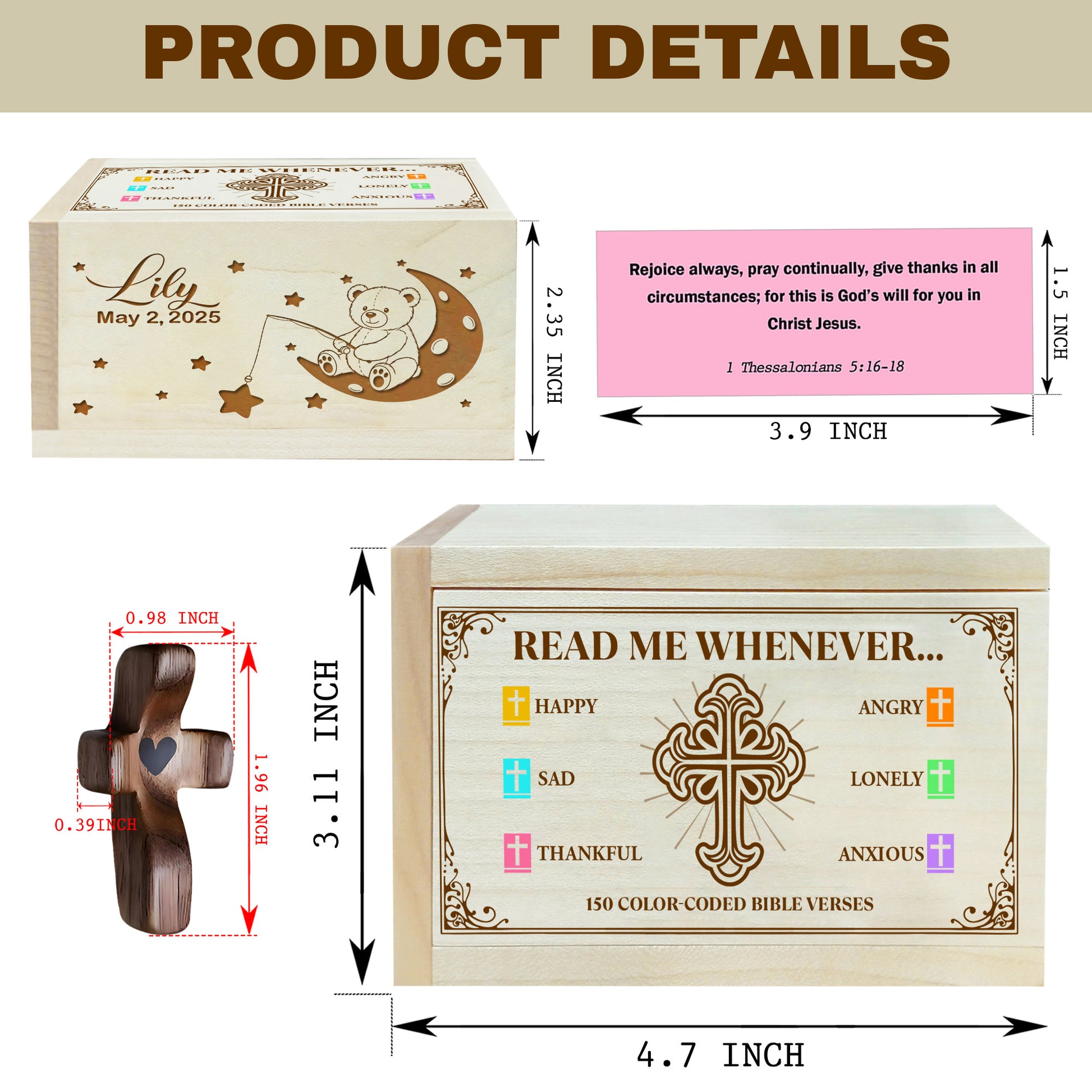 Netecom Personalized Baby Bible Verse Box with 150 Color-Coded Scriptures, Custom Name & Birth Date on Box, Custom Name on Wooden Cross – Christian Faith Keepsake Gift for Newborns, Baptism, or Baby Shower