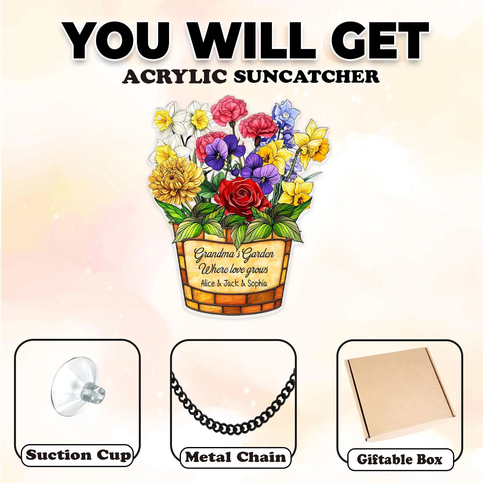 Handcrafted with vibrant faux stained glass effects, this unique suncatcher features the birth month flowers of your loved ones, symbolizing their individuality and the love they bring into your life. When sunlight shines through, it creates a stunning display of colors, casting a warm, joyful glow that fills your home with happiness.