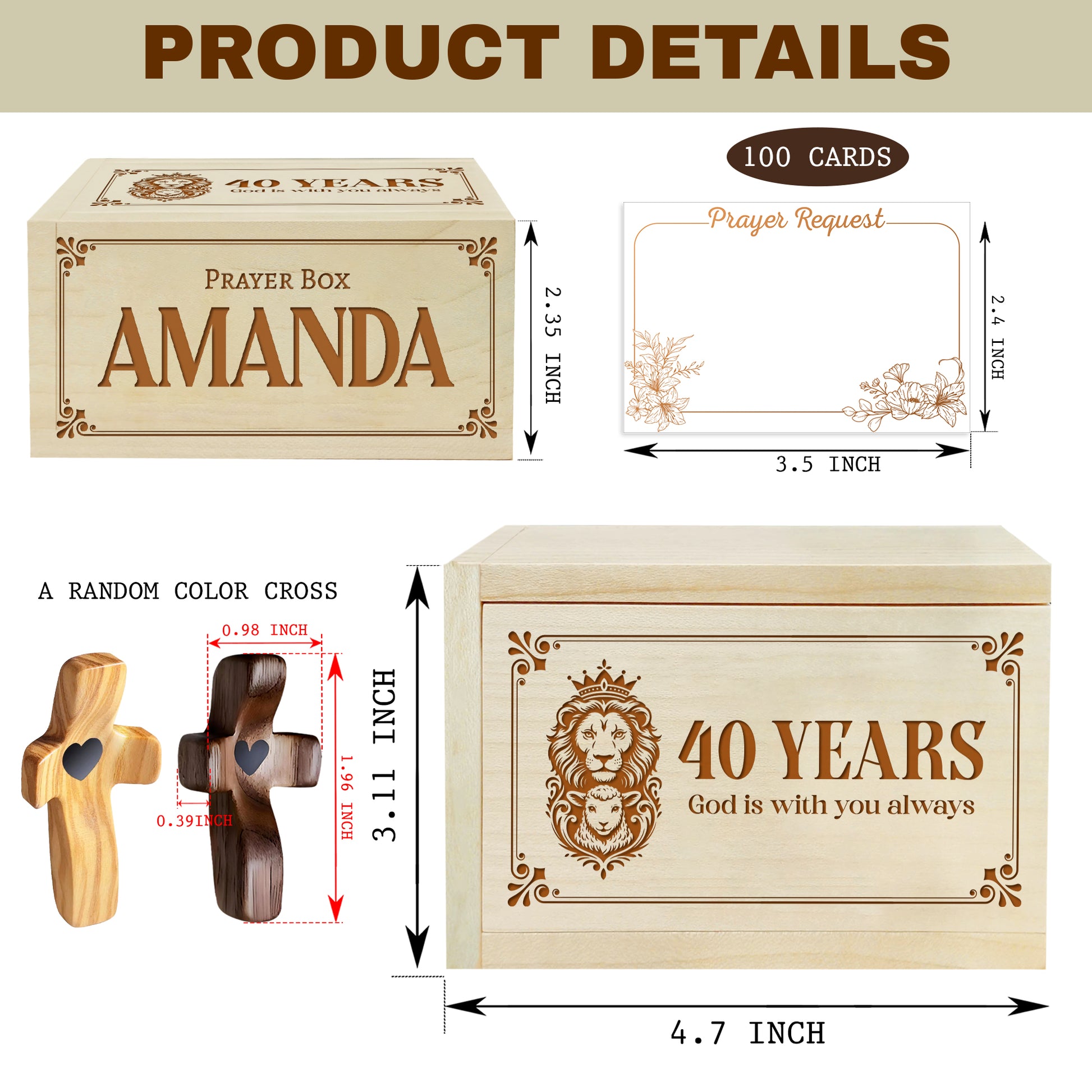 Netecom Personalized Birthday Prayer Box 40 Years with Custom Name, Christian Faith Gift with Wooden Cross & 100 Prayer Request Cards, Meaningful 40th Birthday Gift