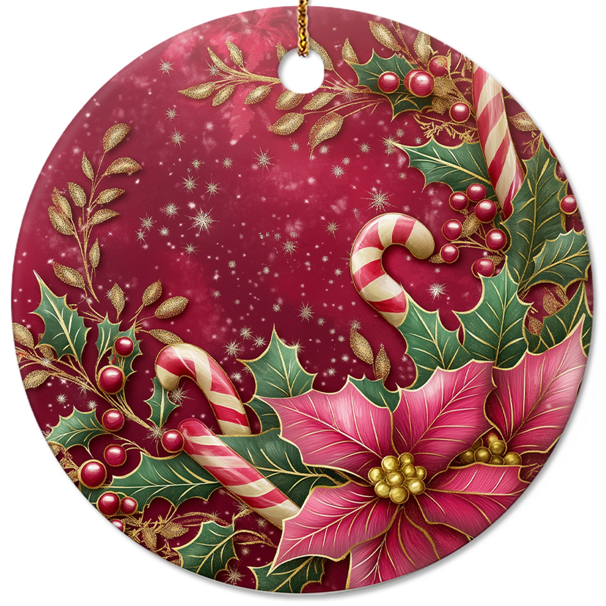 Netecom Pink Poinsettia and Holly Berries Leaves Christmas Ornament, Ceramic Candy Cane Keepsake Ornament for Xmas Tree Decorations, Gifts for Holiday, Party, Home Decor
