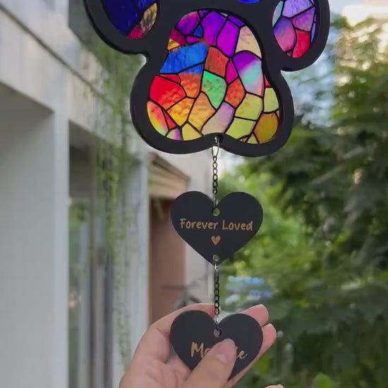 Handcrafted from stained acrylic, this pet remembrance suncatcher features the symbolic Rainbow Bridge and paw prints, making it a meaningful way to keep your pet’s memory alive. Its beautiful design captures sunlight, casting a colorful glow that brings joy and warmth to any space.