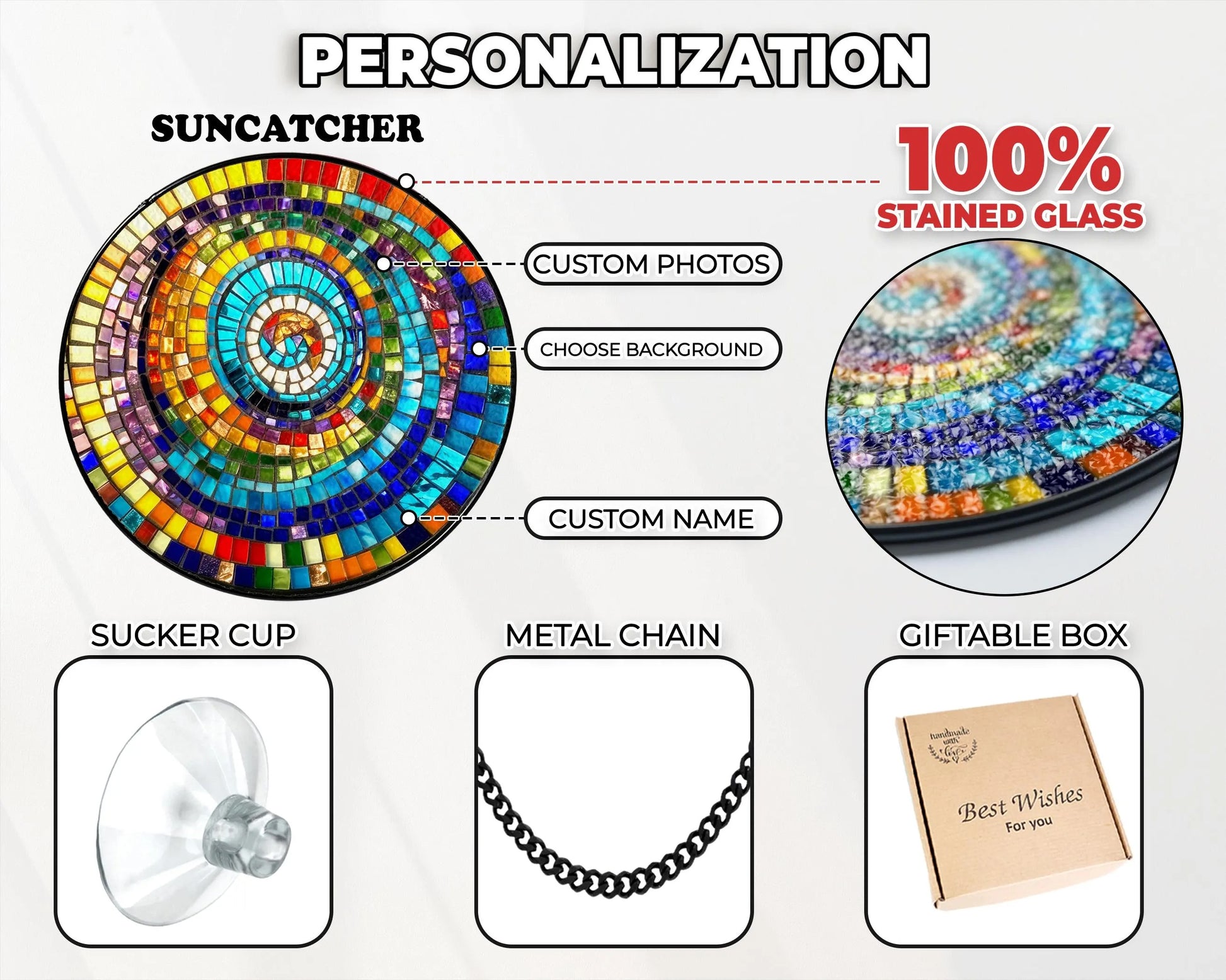 Elevate your home décor with this stunning Rainbow Spiral Suncatcher, featuring a mesmerizing swirl design inspired by mosaic art and geometric patterns. Crafted from premium stained glass and acrylic, this piece captures sunlight beautifully — scattering radiant colors across any wall, window, or room.