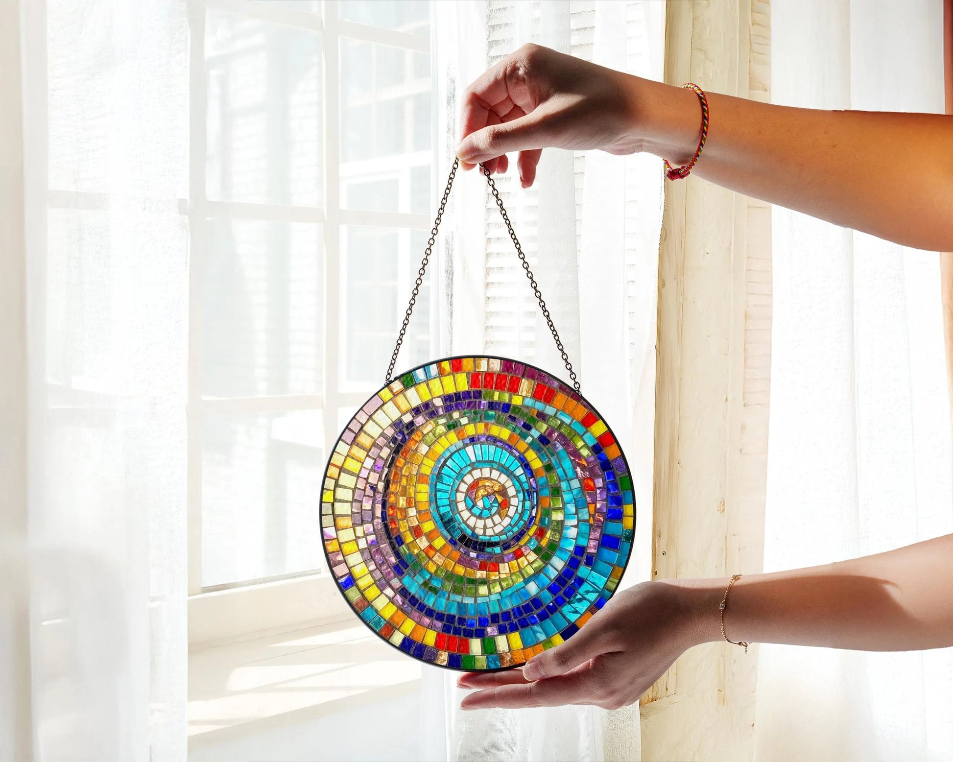 The colorful geometric spiral creates an eye-catching focal point that glows beautifully when sunlight passes through.