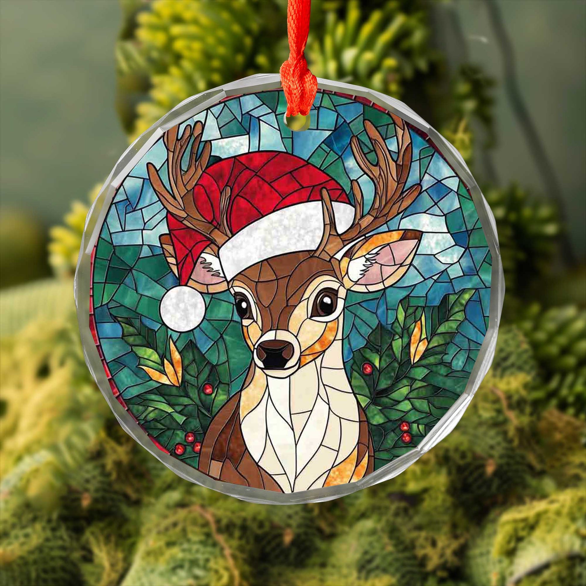 Netecom Reindeer with Santa Hat Stained Glass Ornament – Christmas Tree Decoration, 3-Inch Holiday Keepsake