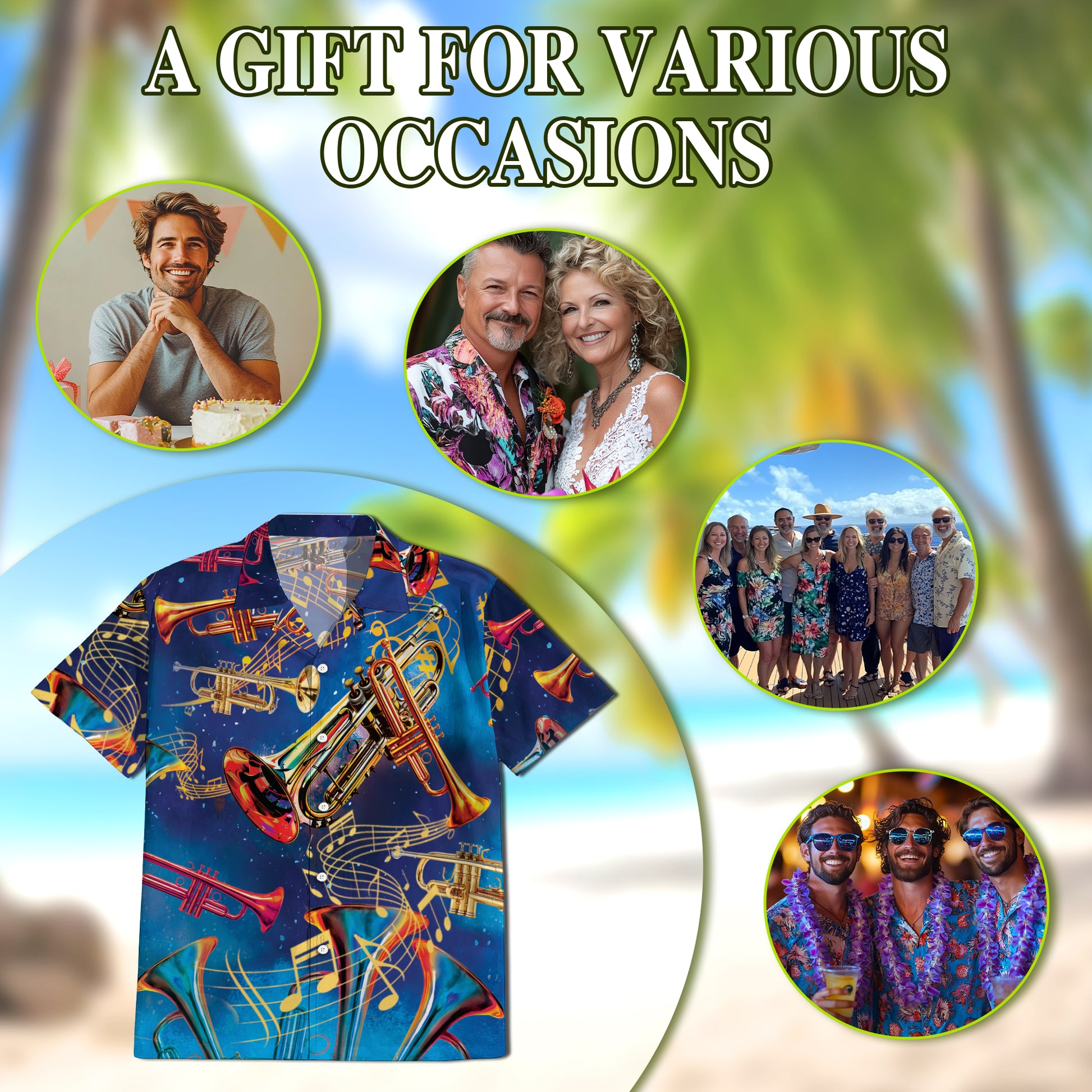 Netecom Retro Trumpet Pattern Hawaiian Shirt for Men, Musical Instruments Button Down Summer Beach Short Sleeve Shirts