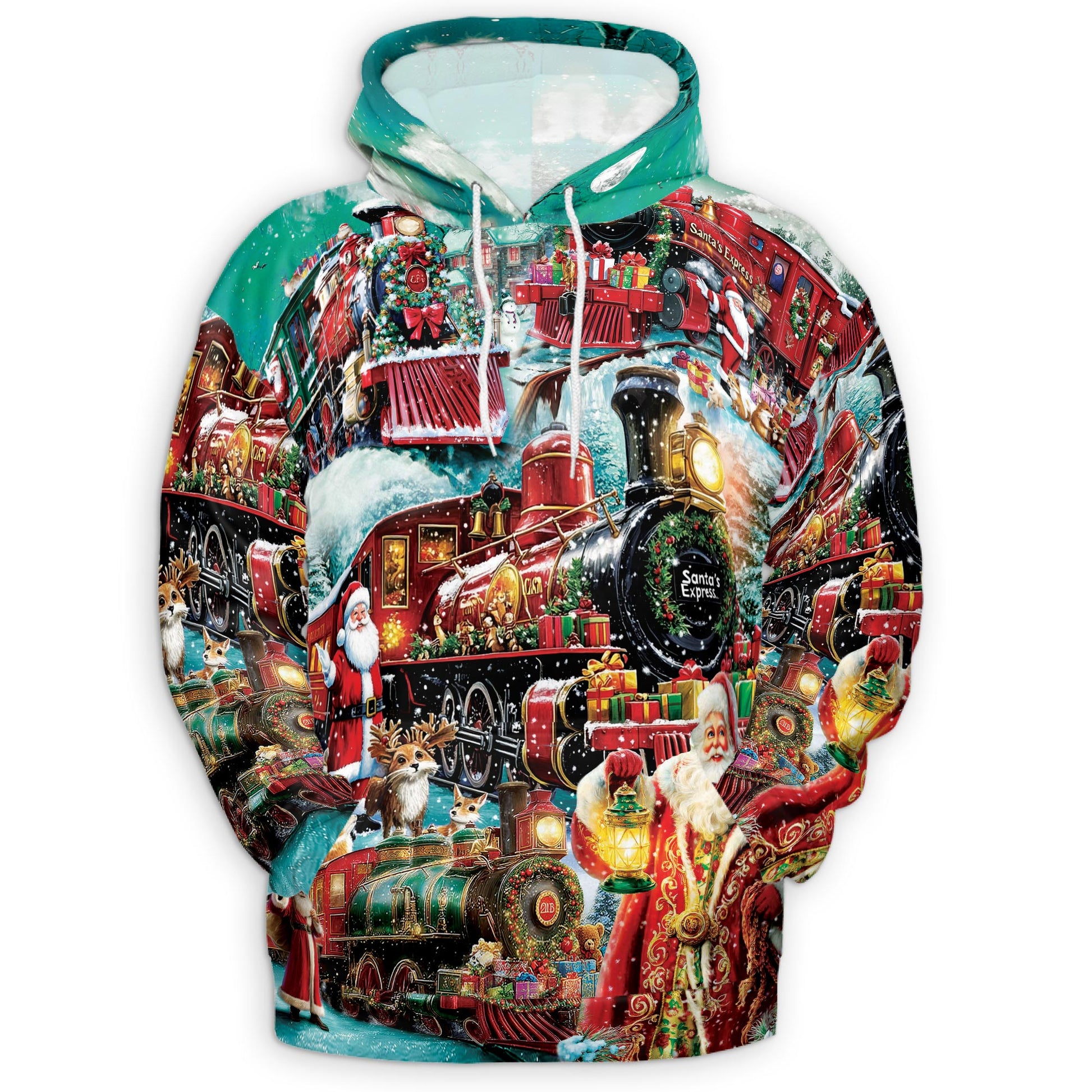 Netecom Santa Claus Christmas Train Print Hoodie with Front Pocket, All Over Vintage Holiday Graphic Sweatshirt Unisex Casual