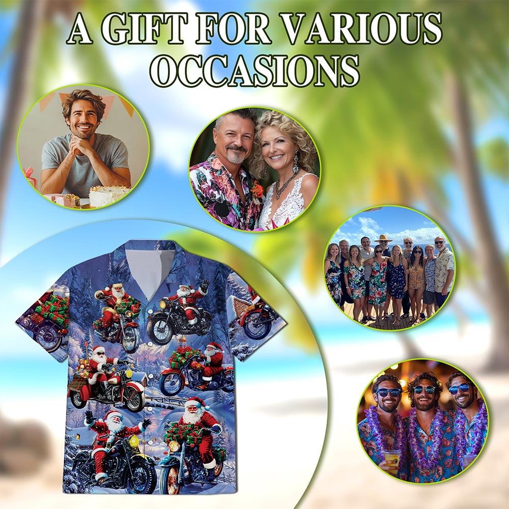 Netecom Santa Claus Riding Motorcycle Hawaiian Shirt for Men, Funny Christmas Biker Button Down Summer Beach Shirt, S-5XL