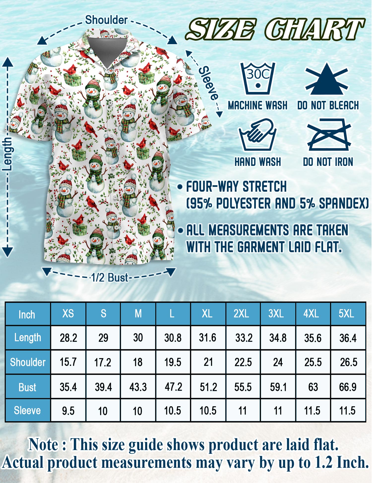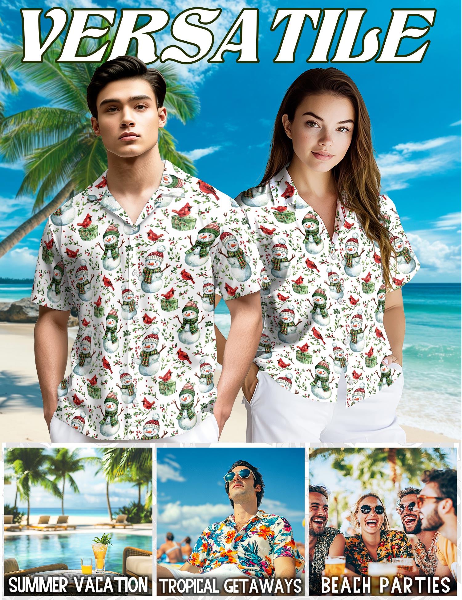 Netecom Snowman and Red Cardinal Christmas Hawaiian Shirt for Men, Cute Holiday Button Down Summer Beach Shirts, S-5XL