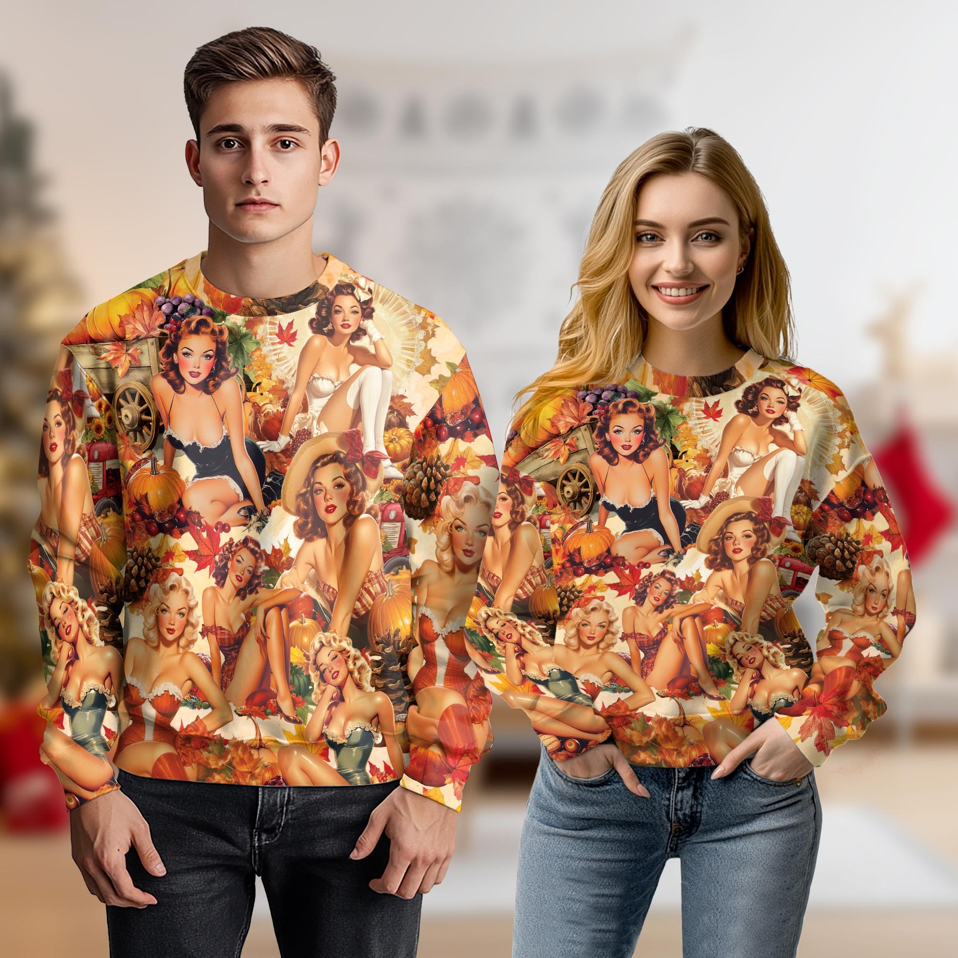 Netecom Vintage Pin Up Girl Thanksgiving Sweatshirt 3D All Over Print, Retro Autumn Style, Crewneck Pullover for Costume Party