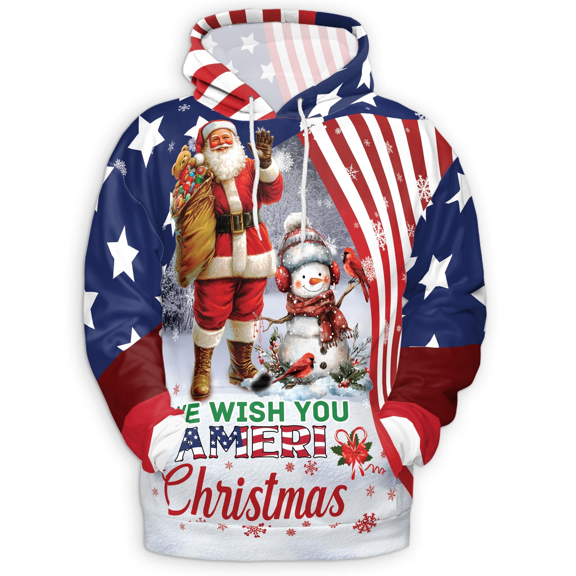 Netecom We Wish You Ameri Christmas 3D Hoodie with Front Pocket, Unisex Casual All Over Patriotic Graphic Sweatshirt