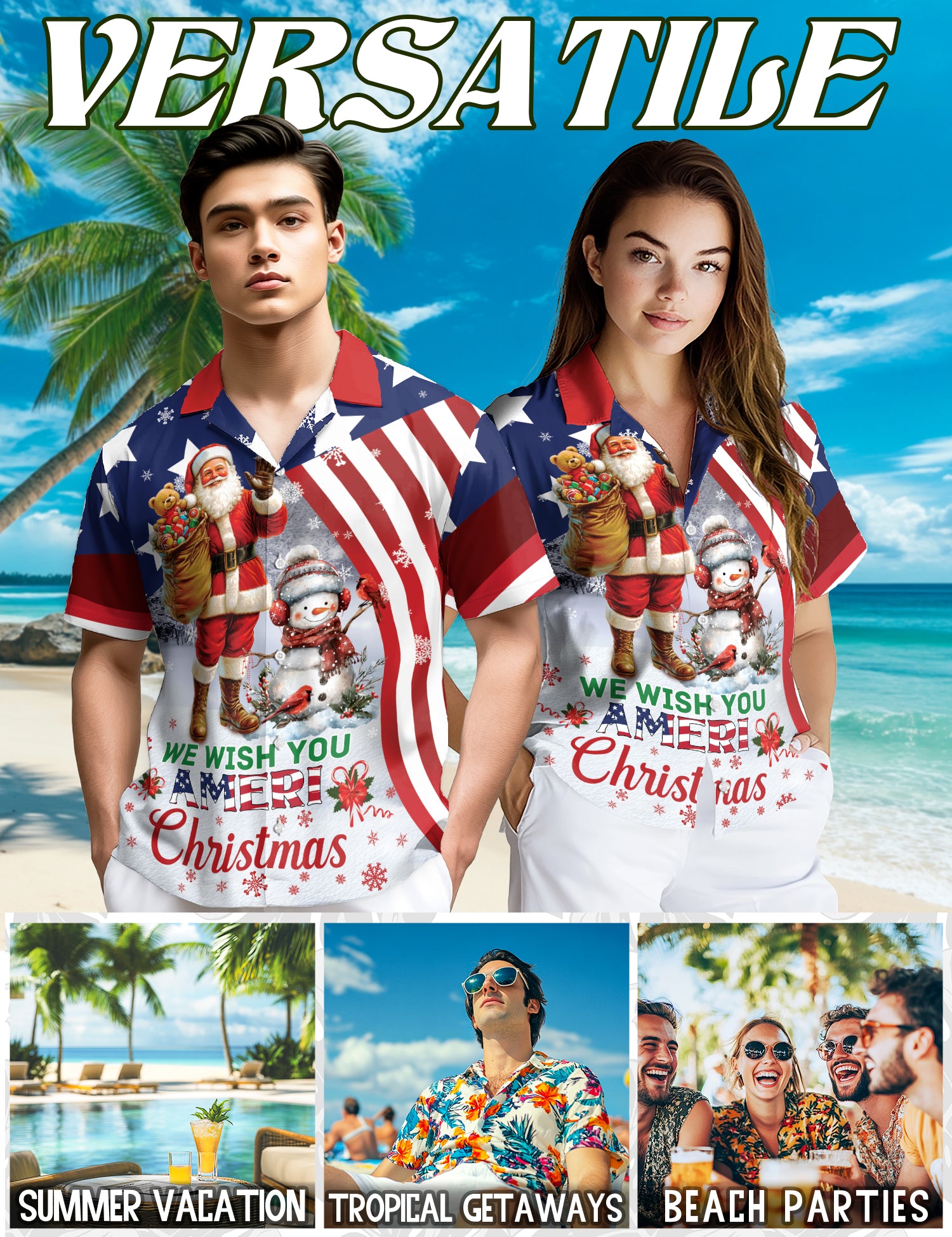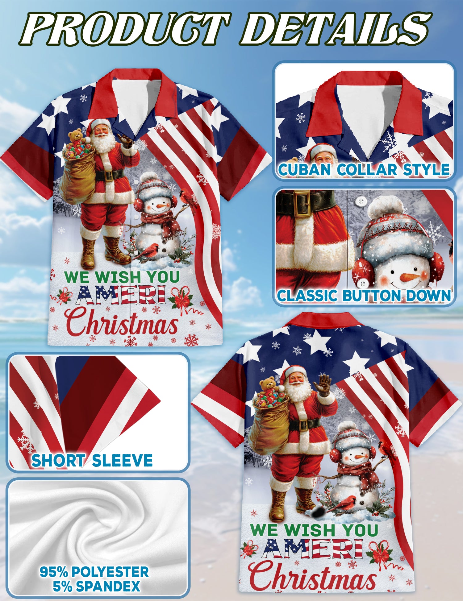 Netecom We Wish You Ameri Christmas Hawaiian Shirt, Patriotic Santa Snowman Flag Button Down Shirt