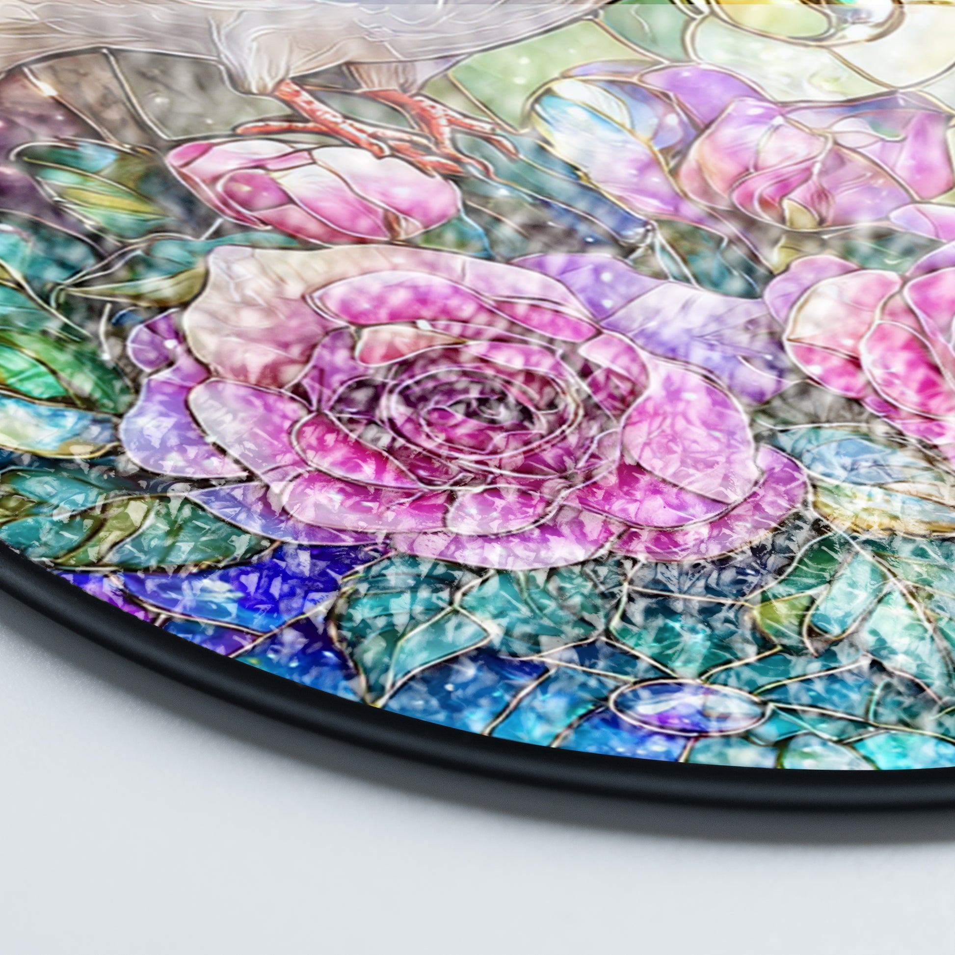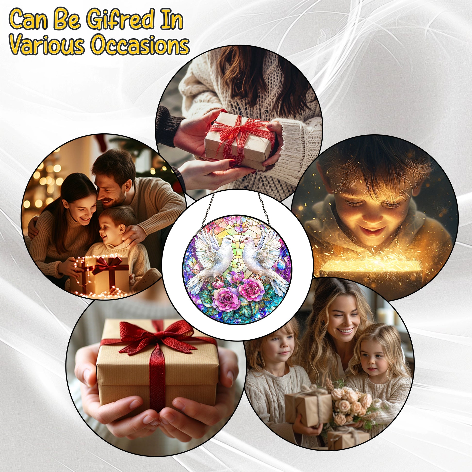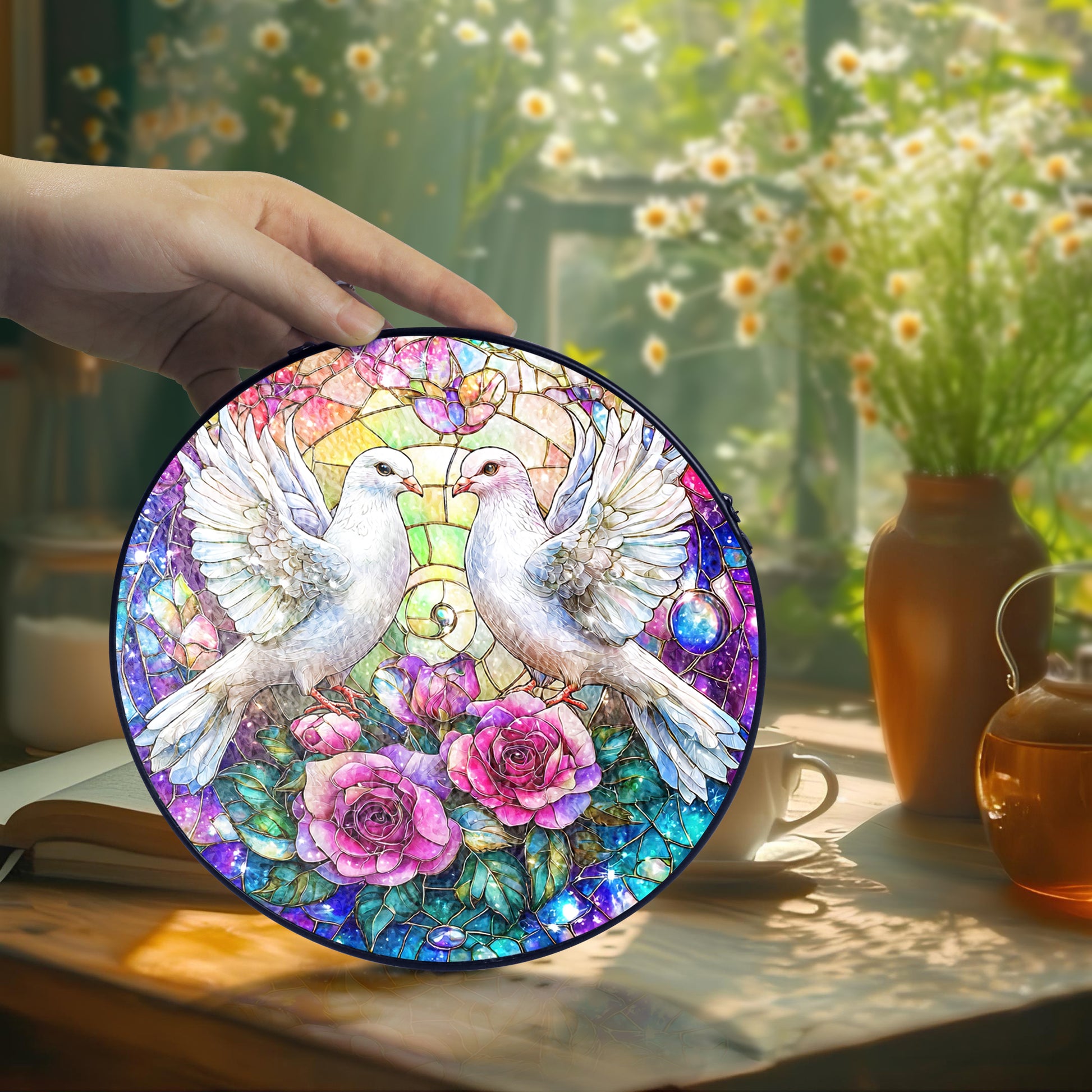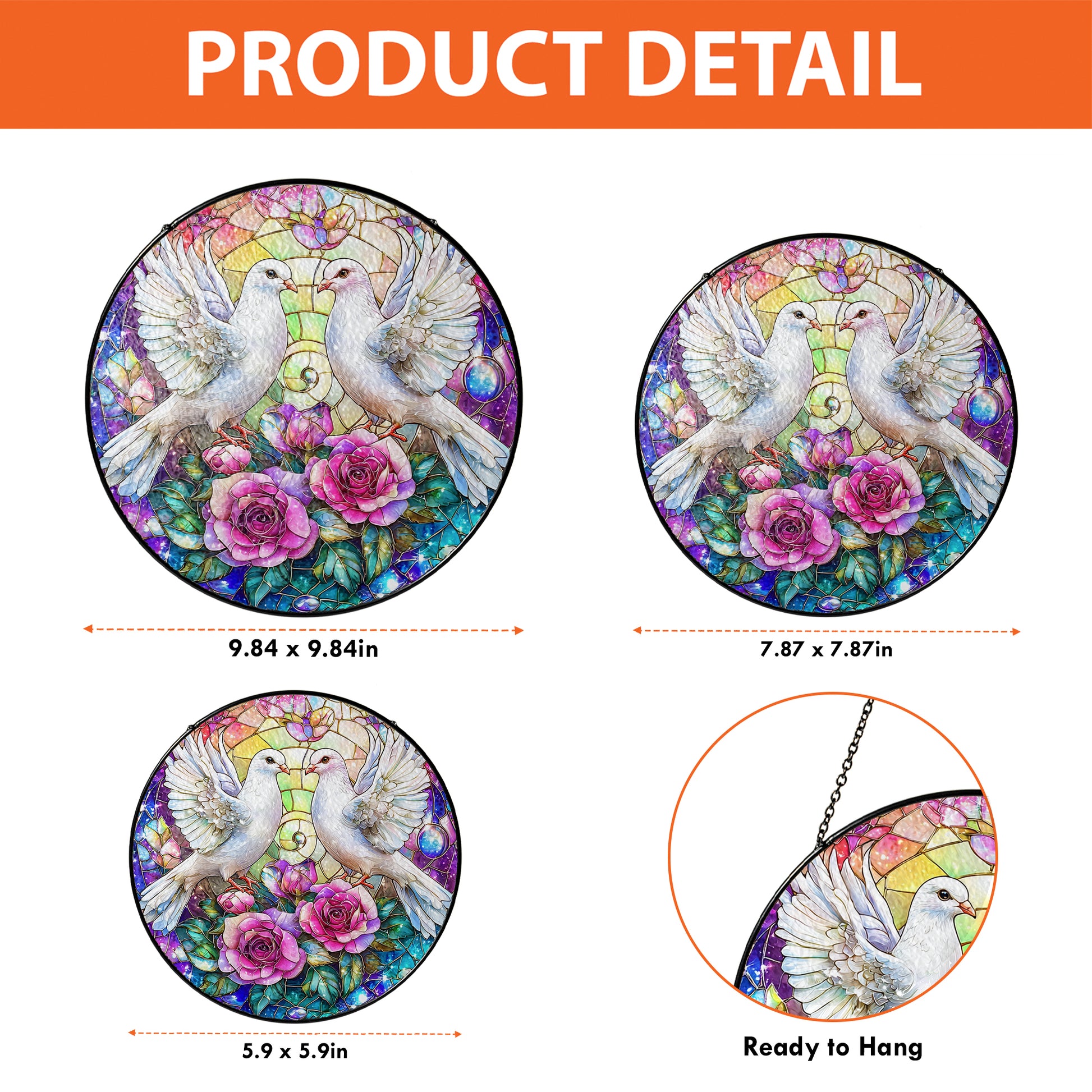 Featuring two graceful doves surrounded by blooming roses and radiant stained-glass hues, this piece captures the essence of harmony and affection. Perfect for adding elegance to windows, living rooms, or sunlit corners, it reflects stunning colors whenever sunlight passes through.